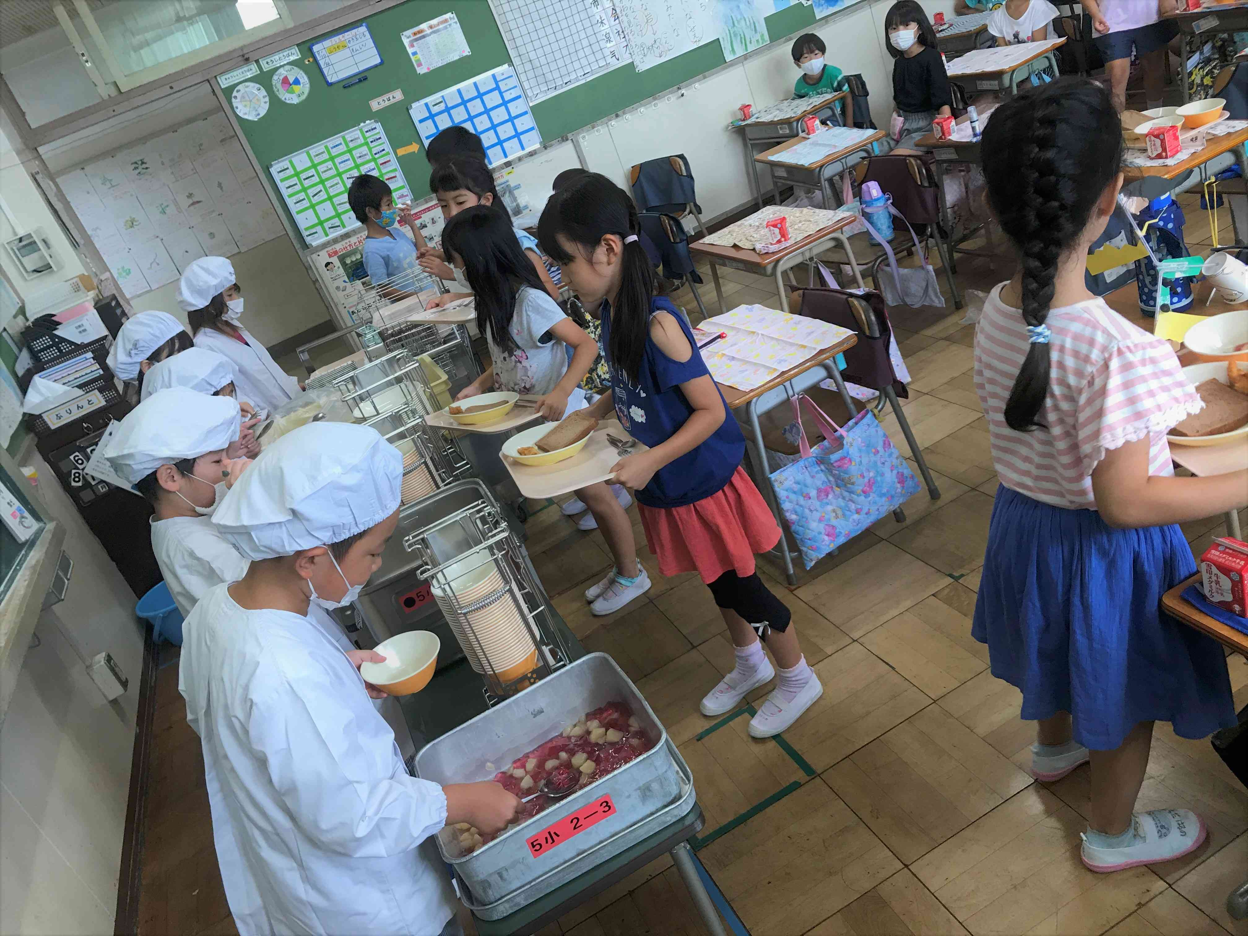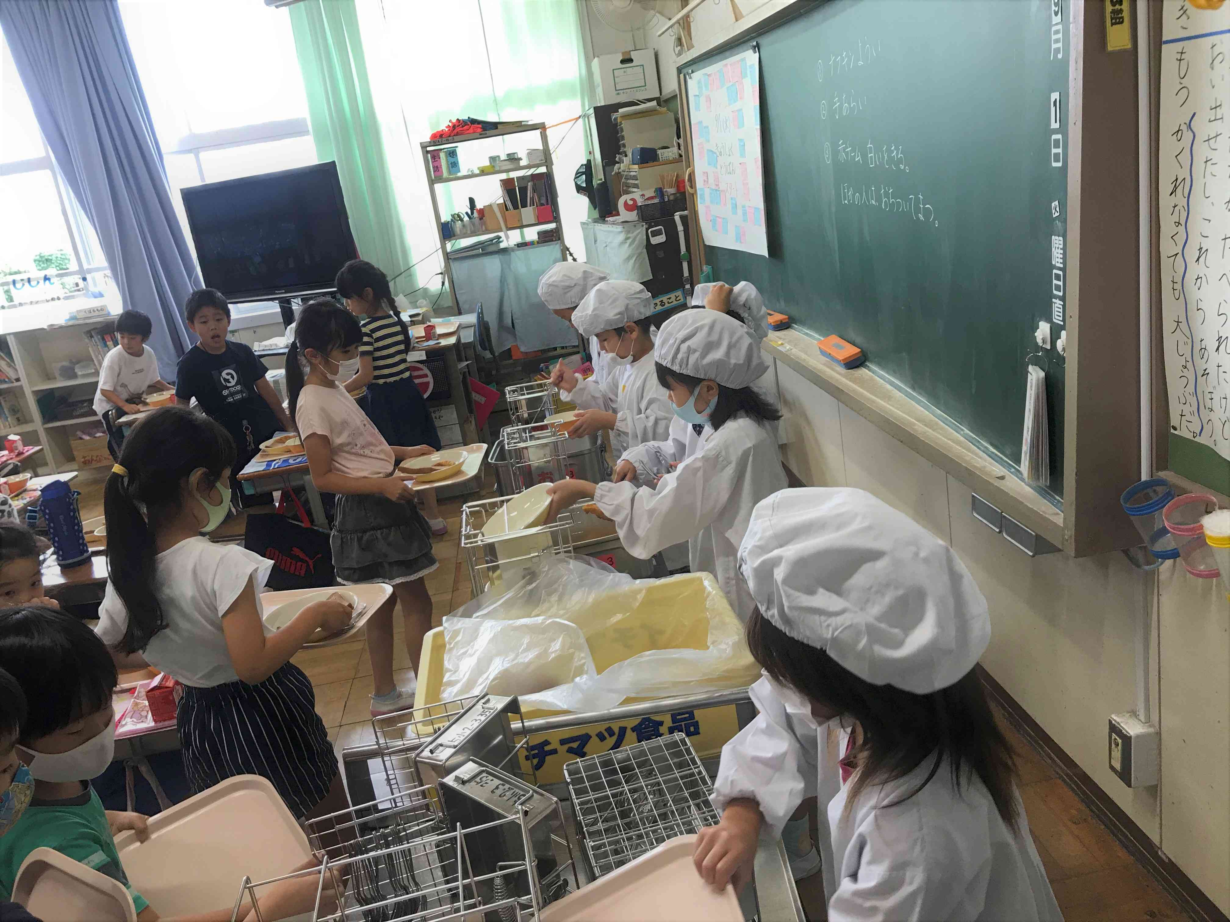 久しぶりの給食当番の活動でした。事前に気を付けることや頑張りたいことなどを話し合い、一生懸命取り組みました。 こぼさないように丁寧に盛り付けたり、数を数えながらよそったりするなど本当によくがんばりました。