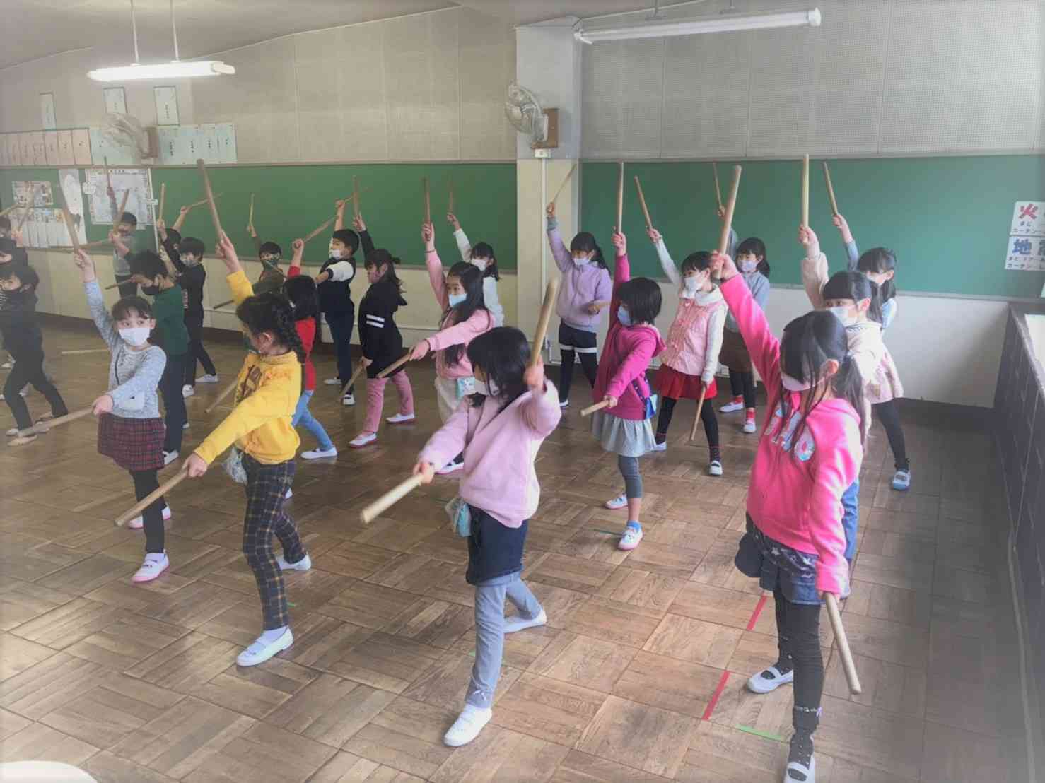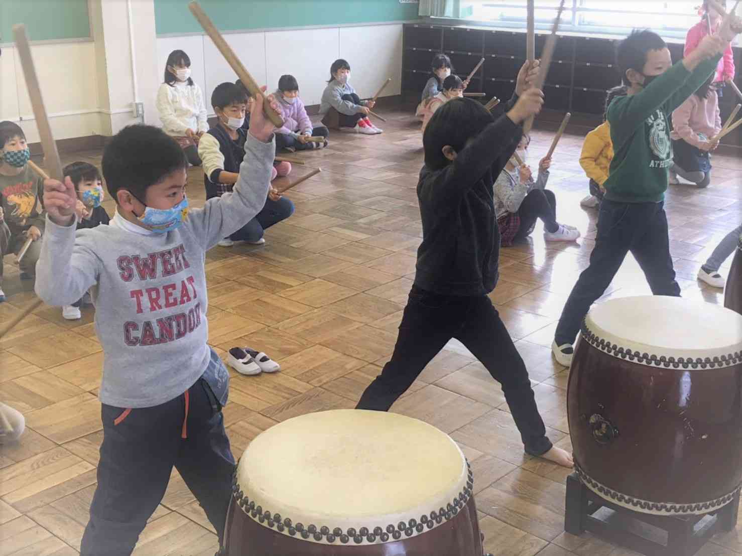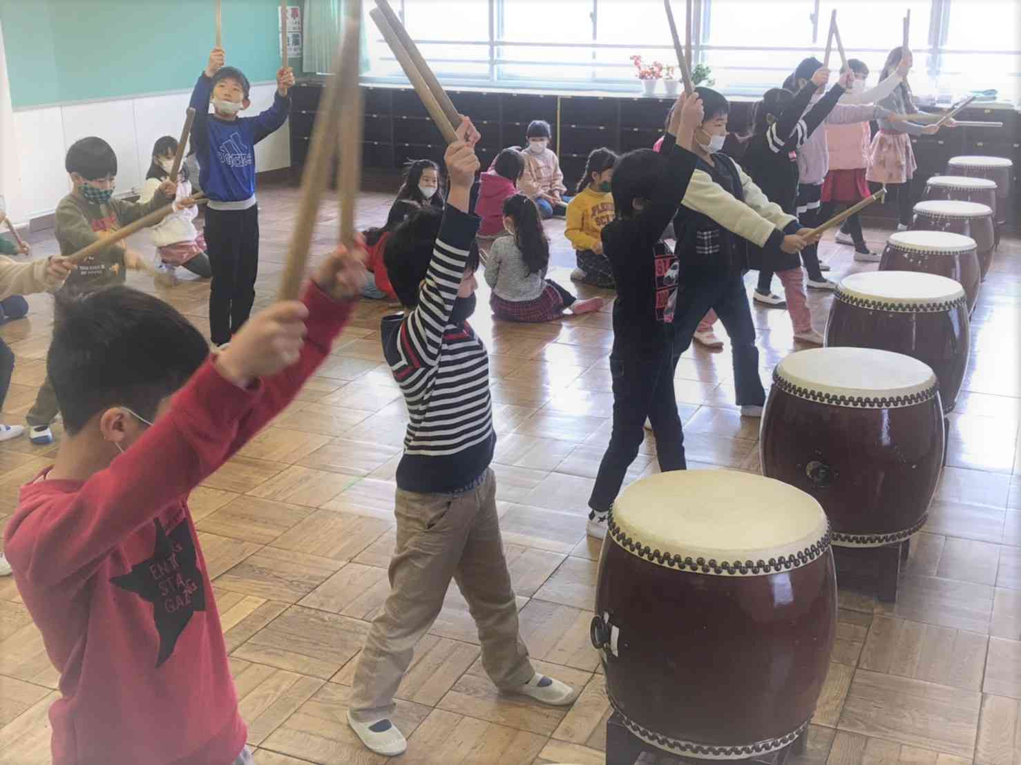 昨年に引き続き山下先生に和太鼓を教えてもらいました。 足を開いてどっしりと構え、大きなフォームでかっこよく叩きました。 チームに分かれて「わっしょい!」と「結び太鼓」をローテションしながら演奏しました。 よい音を出そううと一生懸命頑張りました。