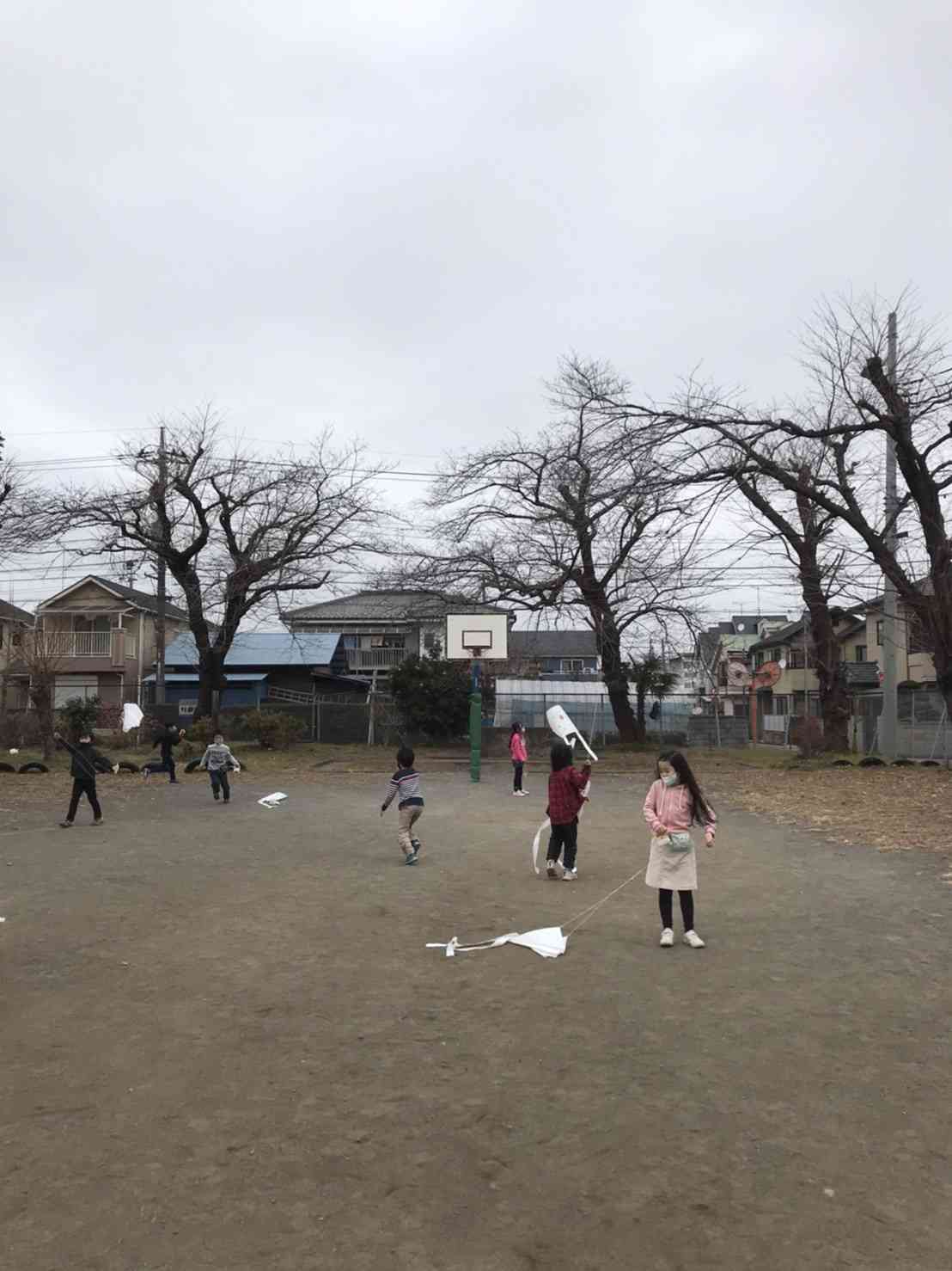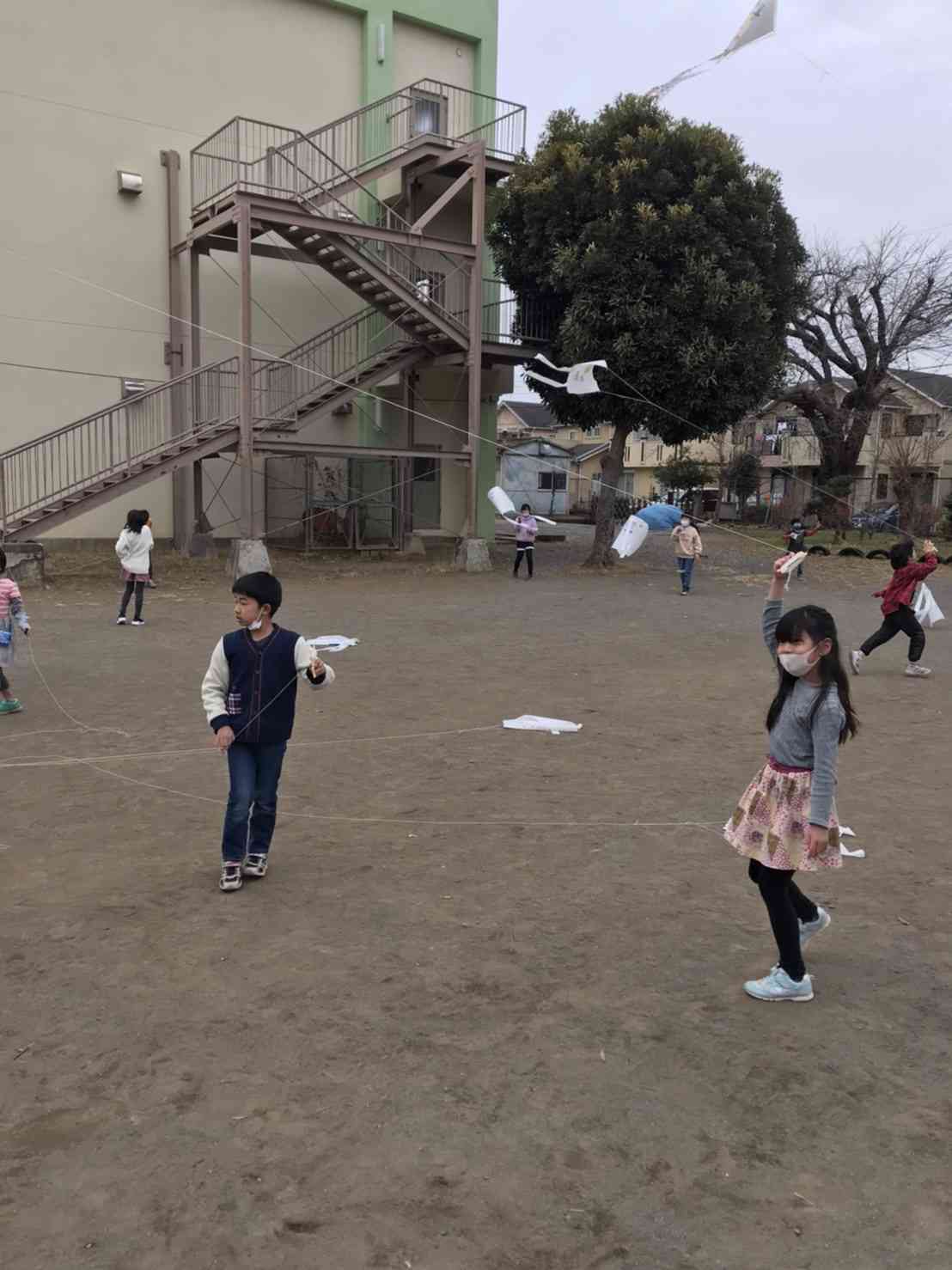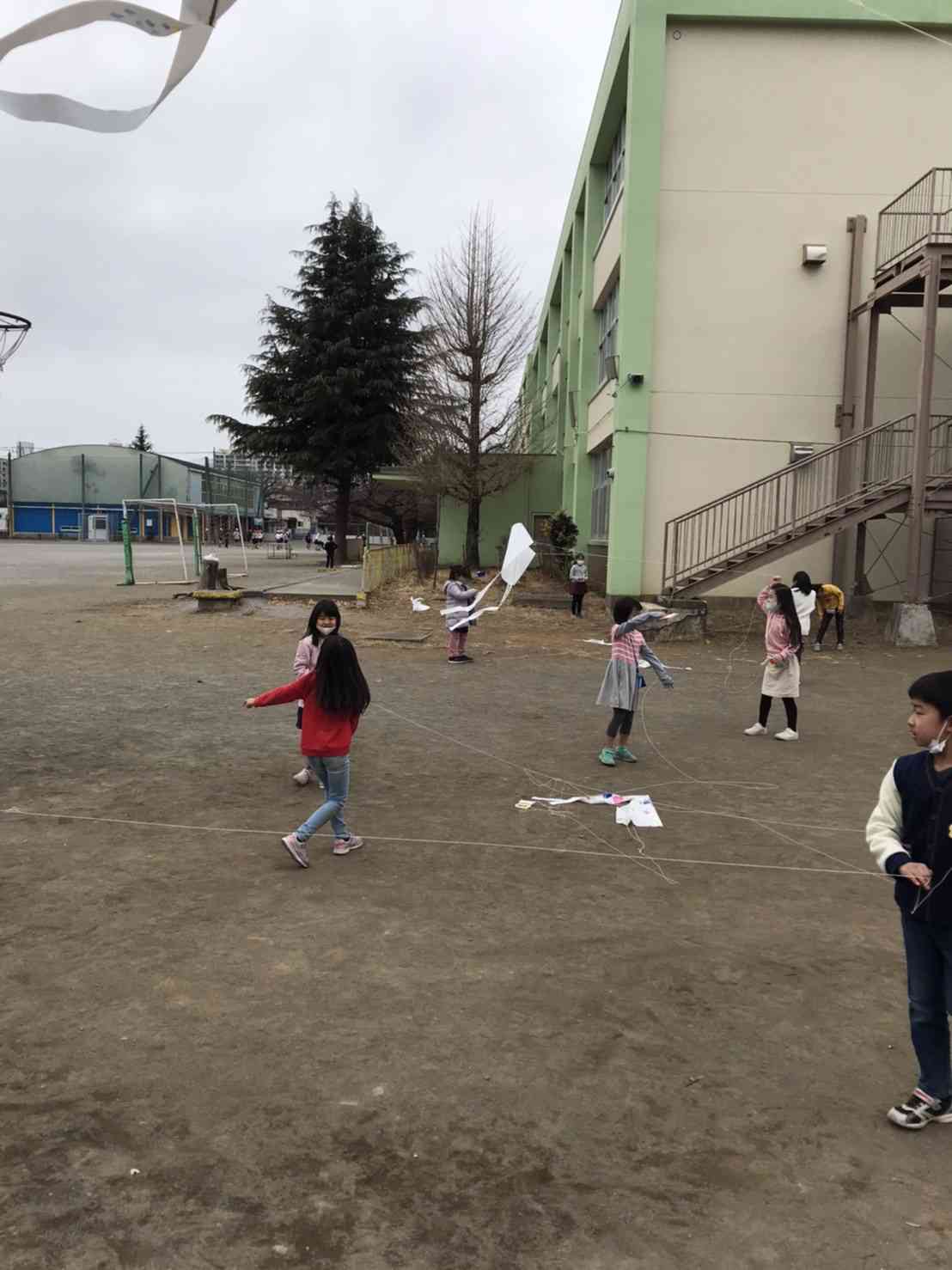 図工の時間に作った凧を上げました。 友達の糸と絡まったり、木に引っかかったりすることもありましたが、上手に上げることができました。 けん玉やこまなど、他にも昔遊びに親しむ予定です。