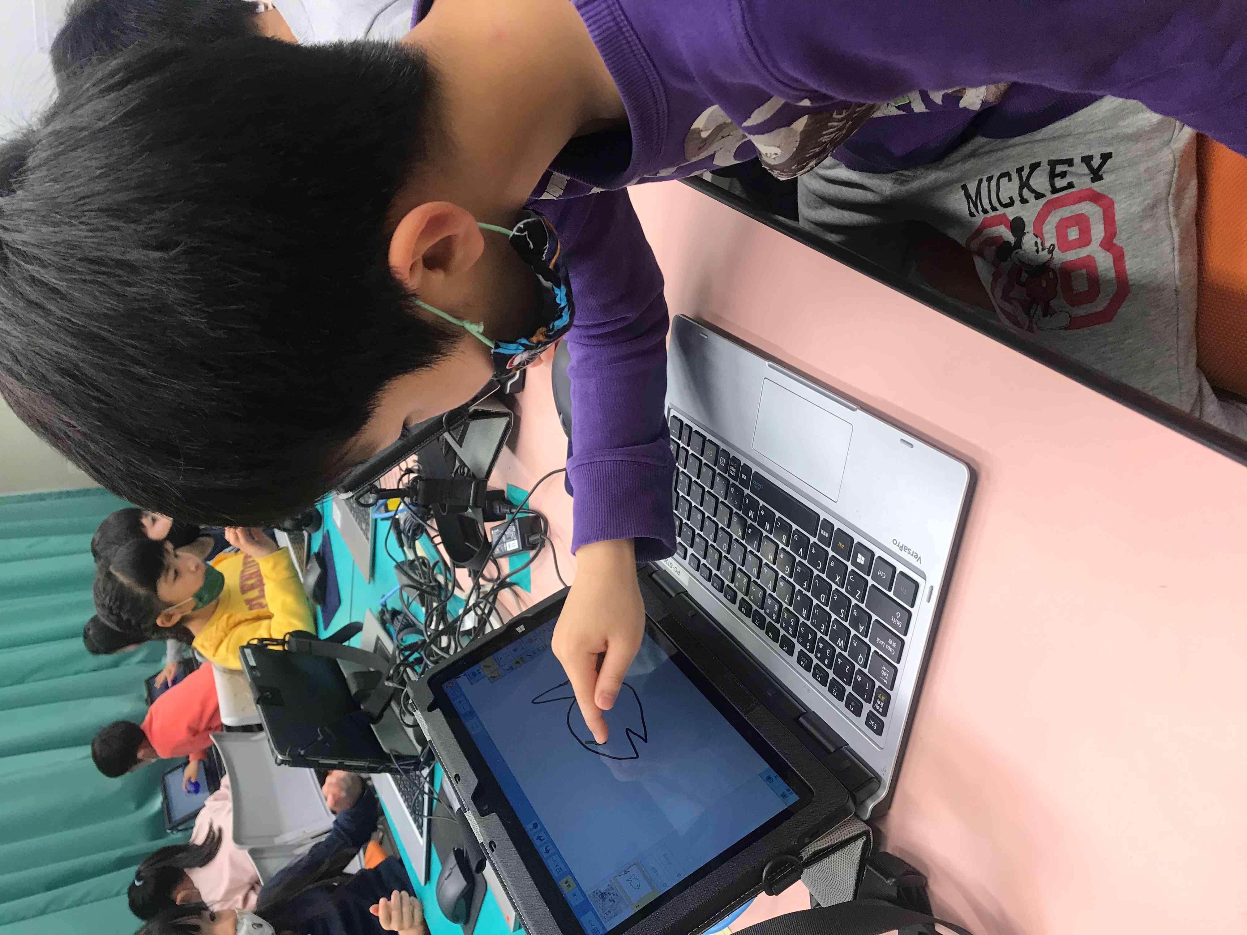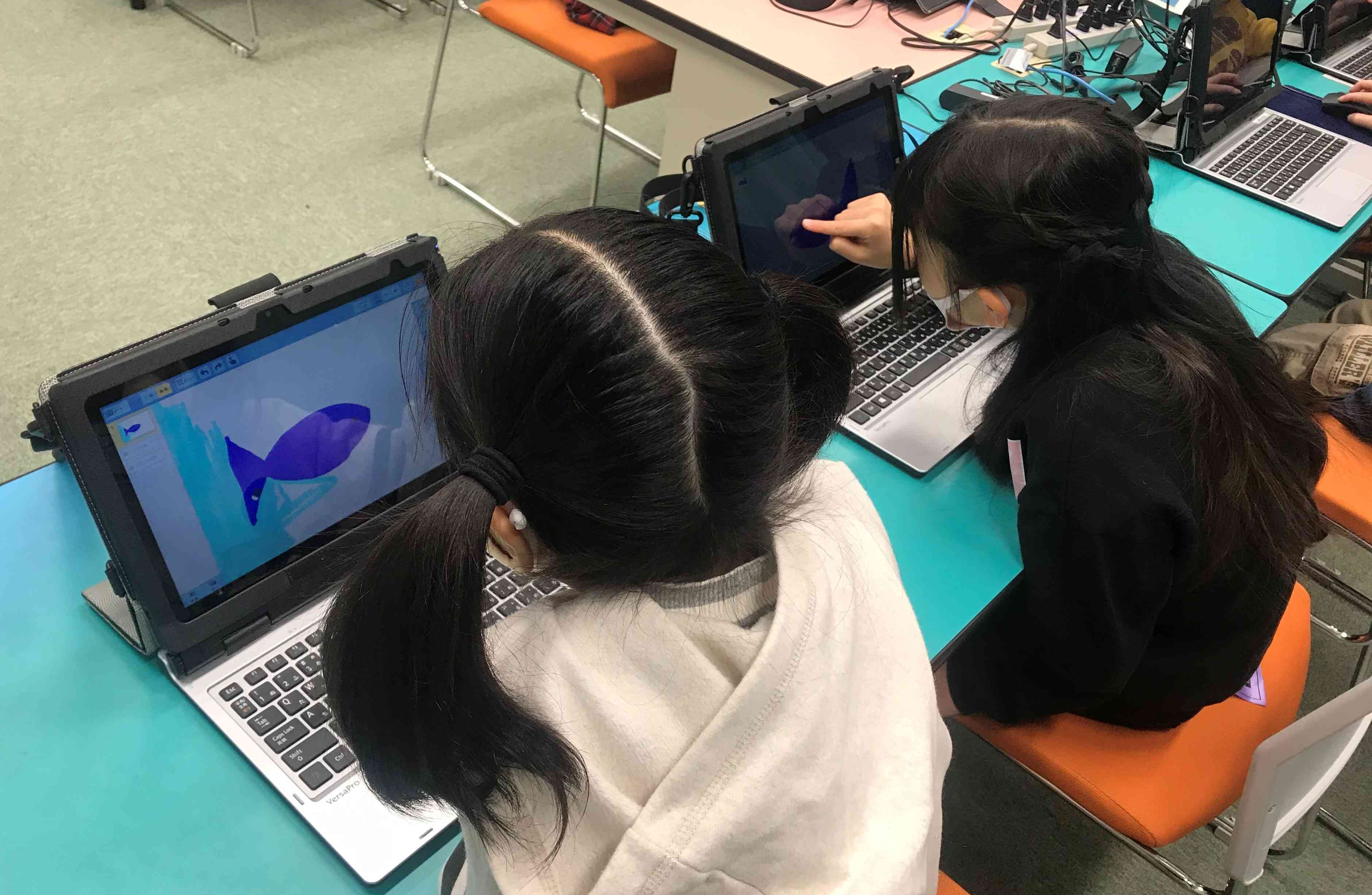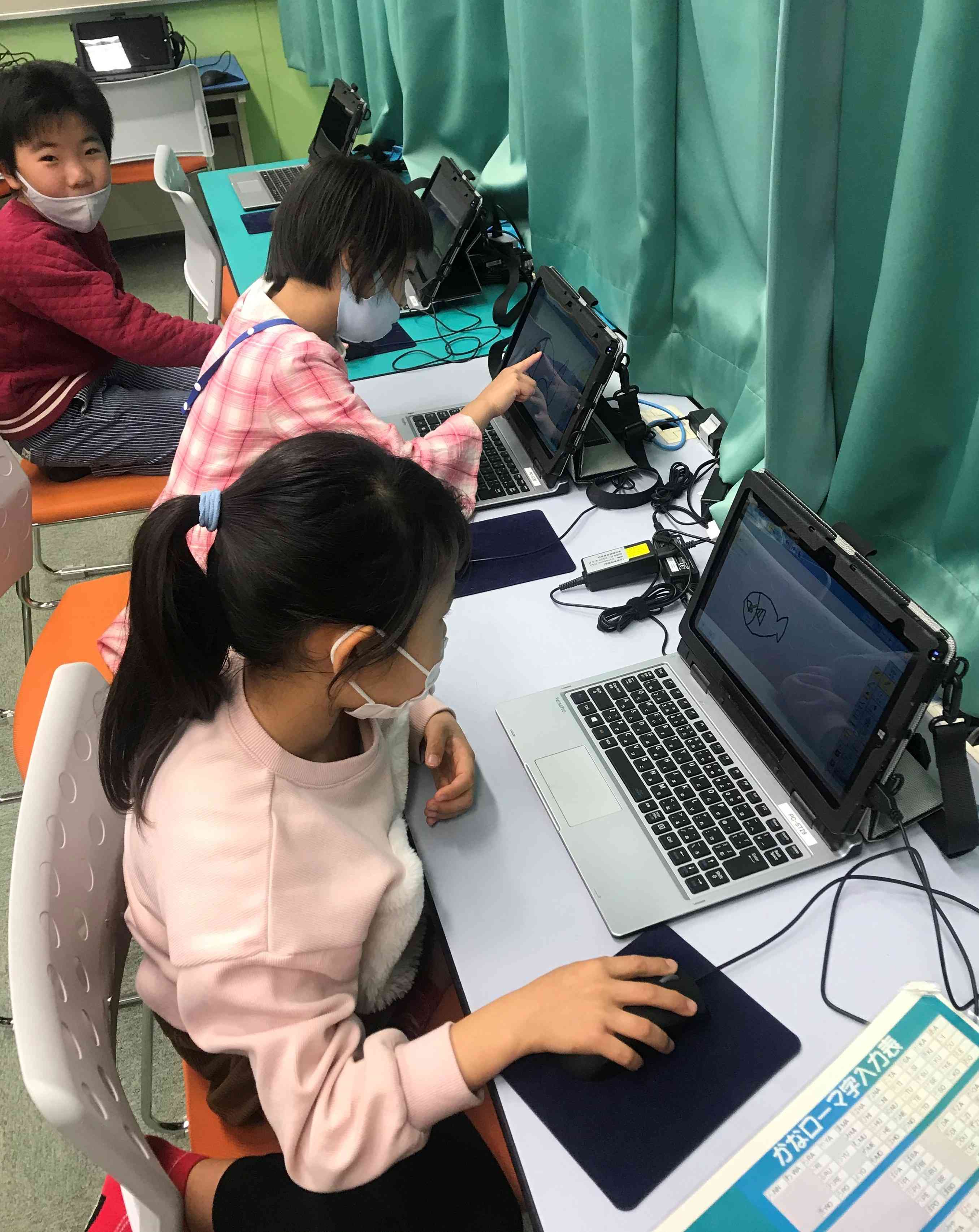パソコン室でタブレットの学習を行いました。 今回は、起動からログイン、シャットダウンまでを自分で行いました。 マウスや自分の指を使って魚を描いたり、スタンプを押したりするなど楽しく学習しました。 次回は、命令(プログラム)を出して動かす学習をする予定です。