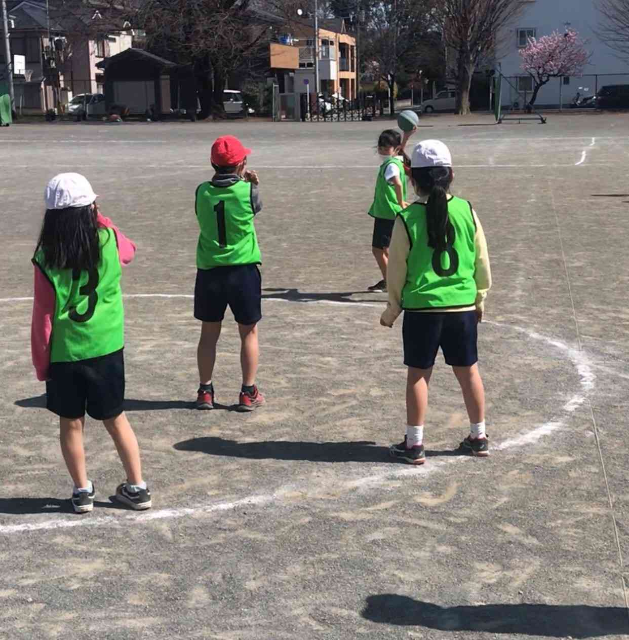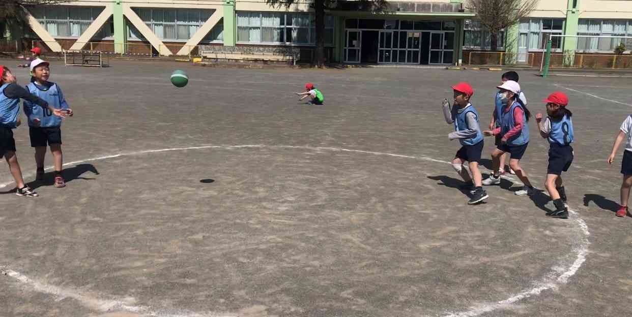 ボール投げ遊びでは、ドッジボールをしています。 準備運動でチームごとに分かれて中当てをしてから、ドッジボールを行っています。 女の子でも男の子の速いボールを捕ろうと挑戦する子も出てきました。