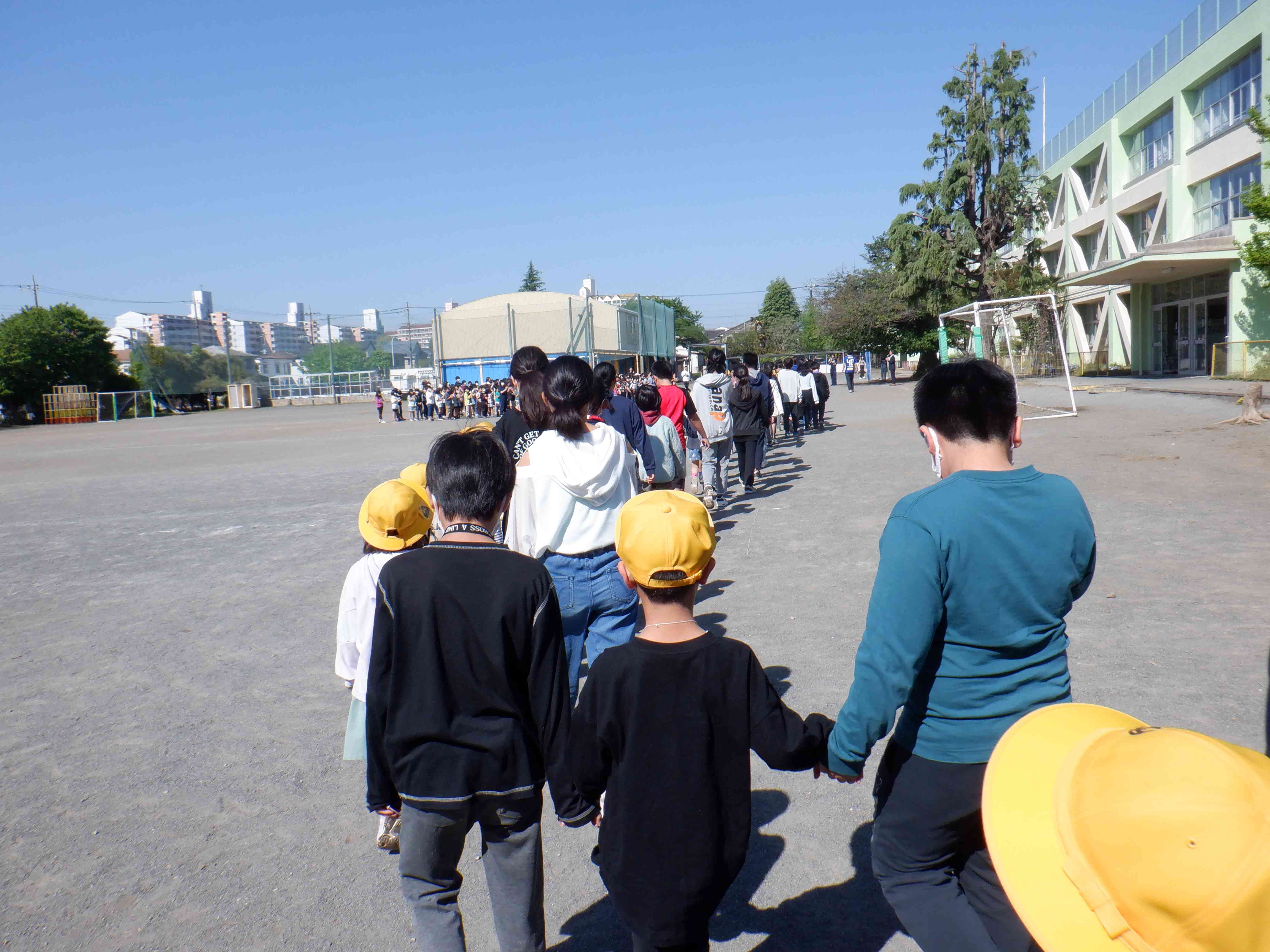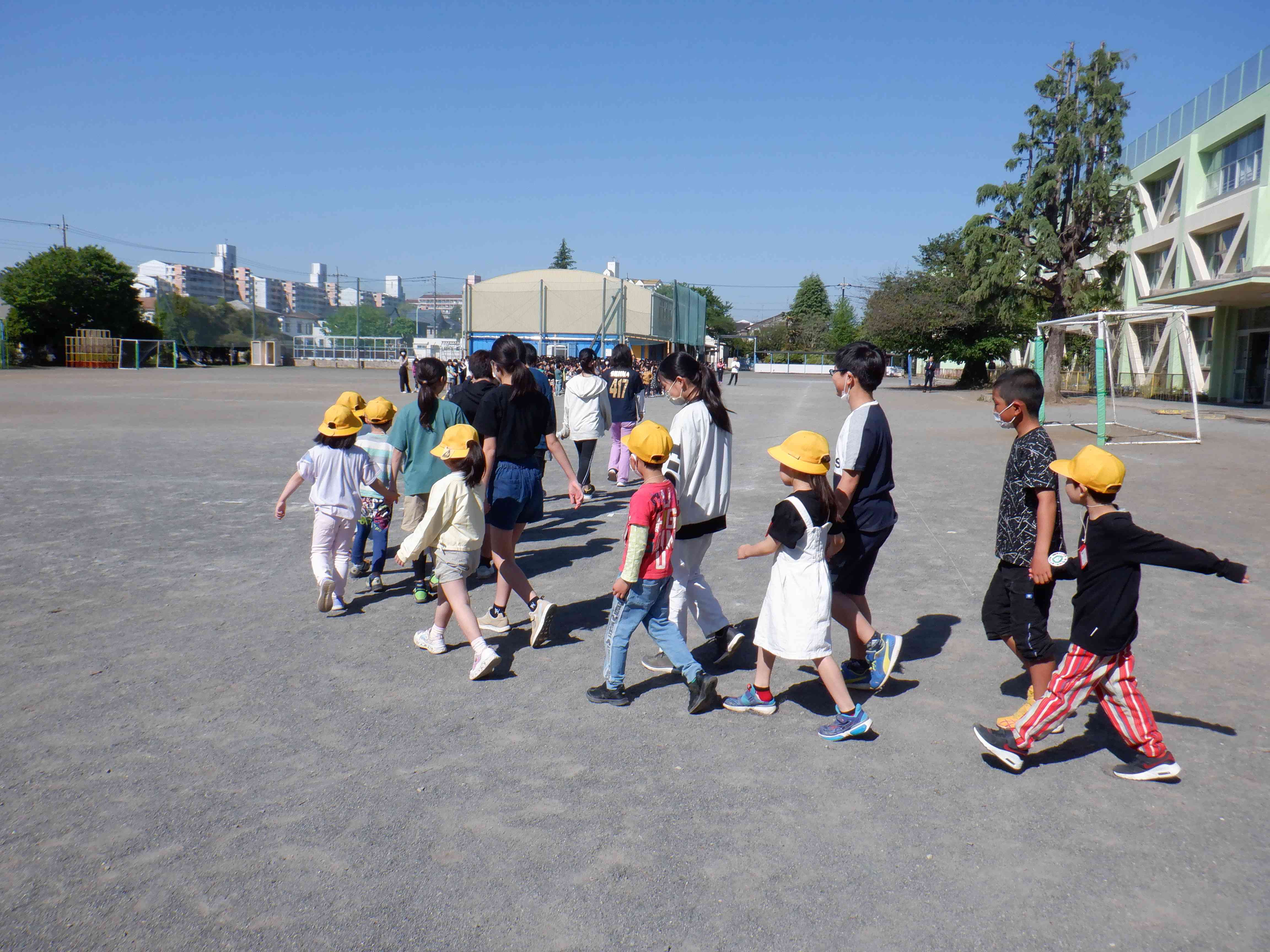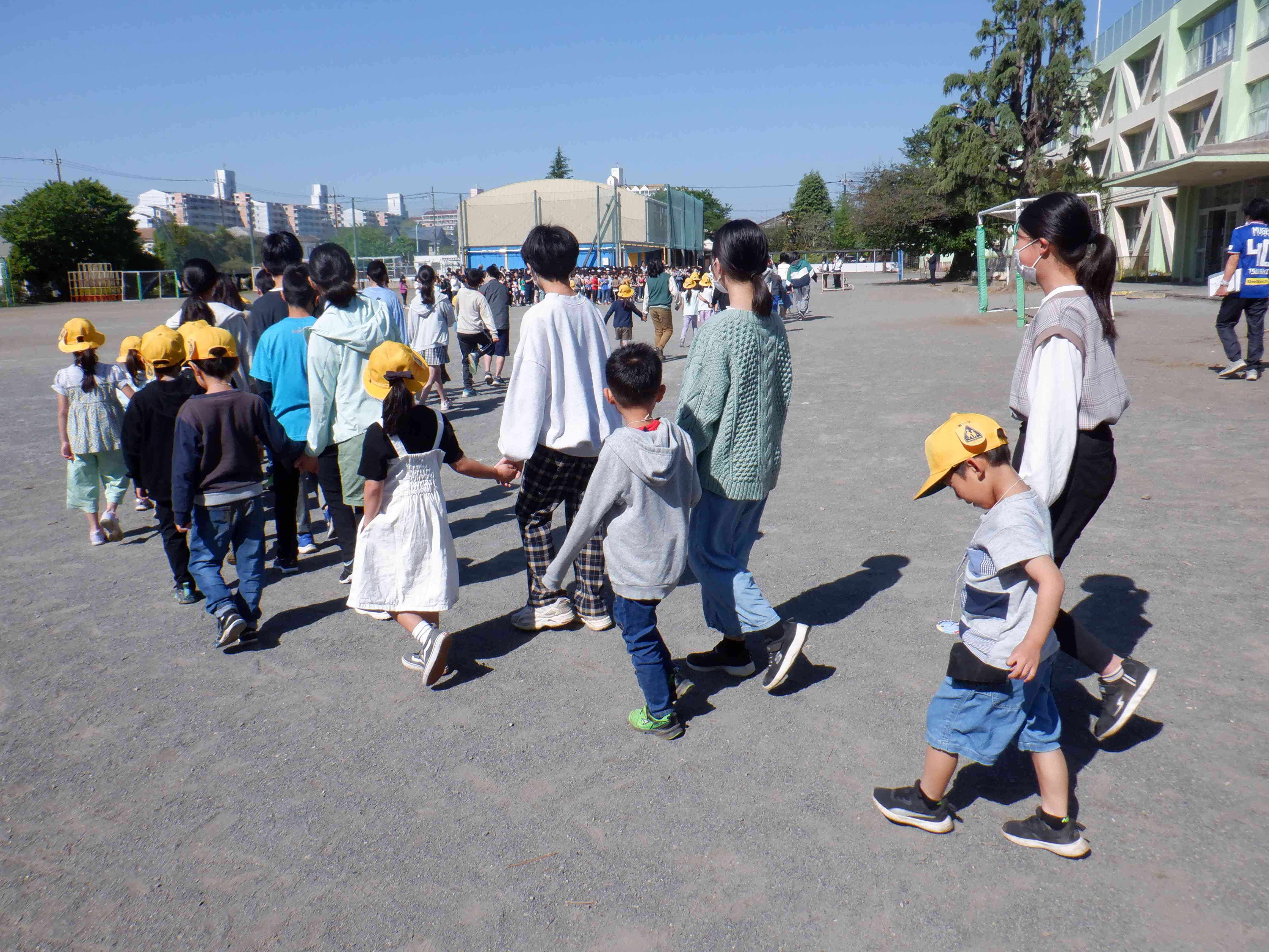 1年生を迎える会をやりました。 写真は1年生が6年生と一緒に入場する場面です。