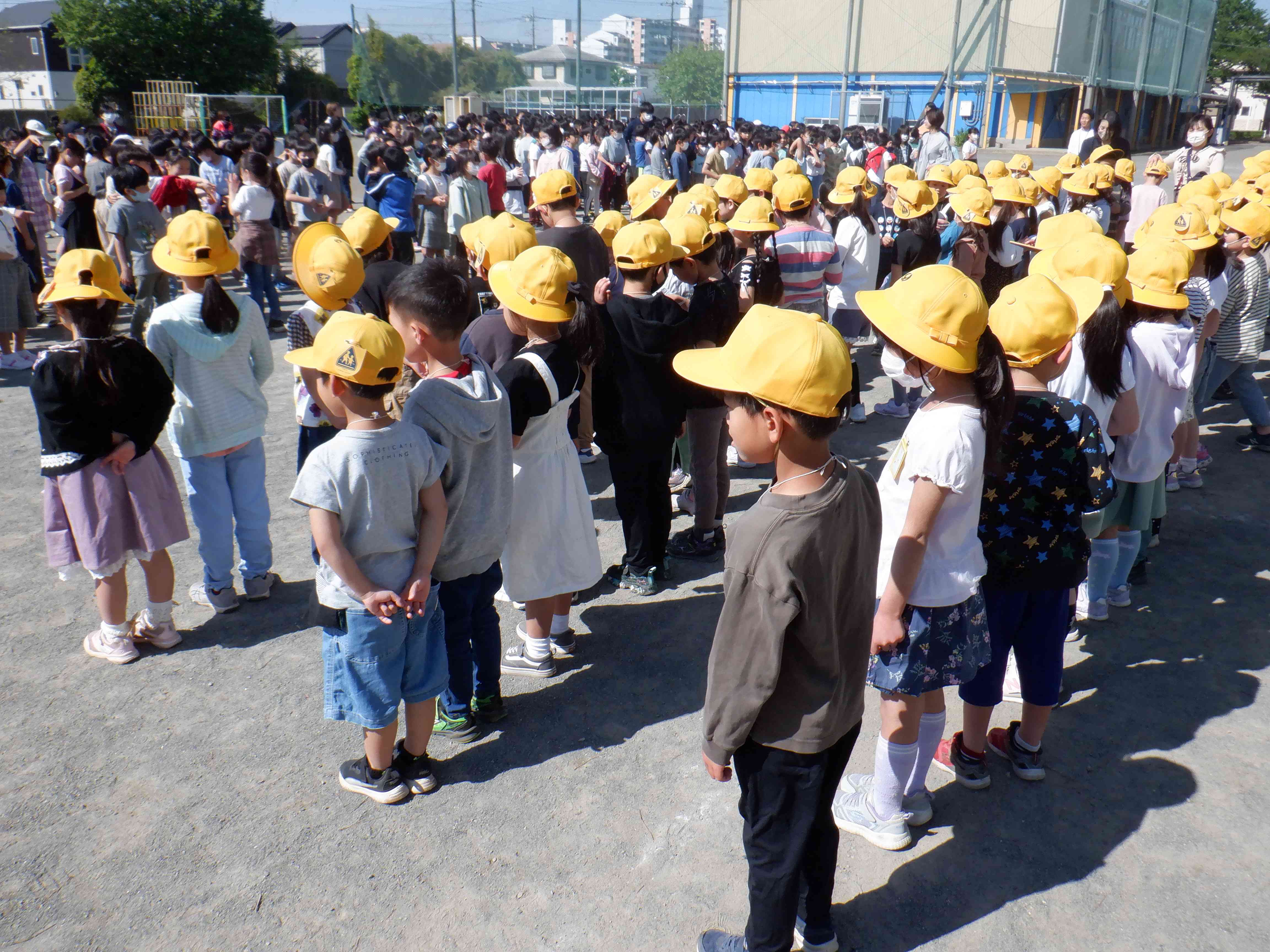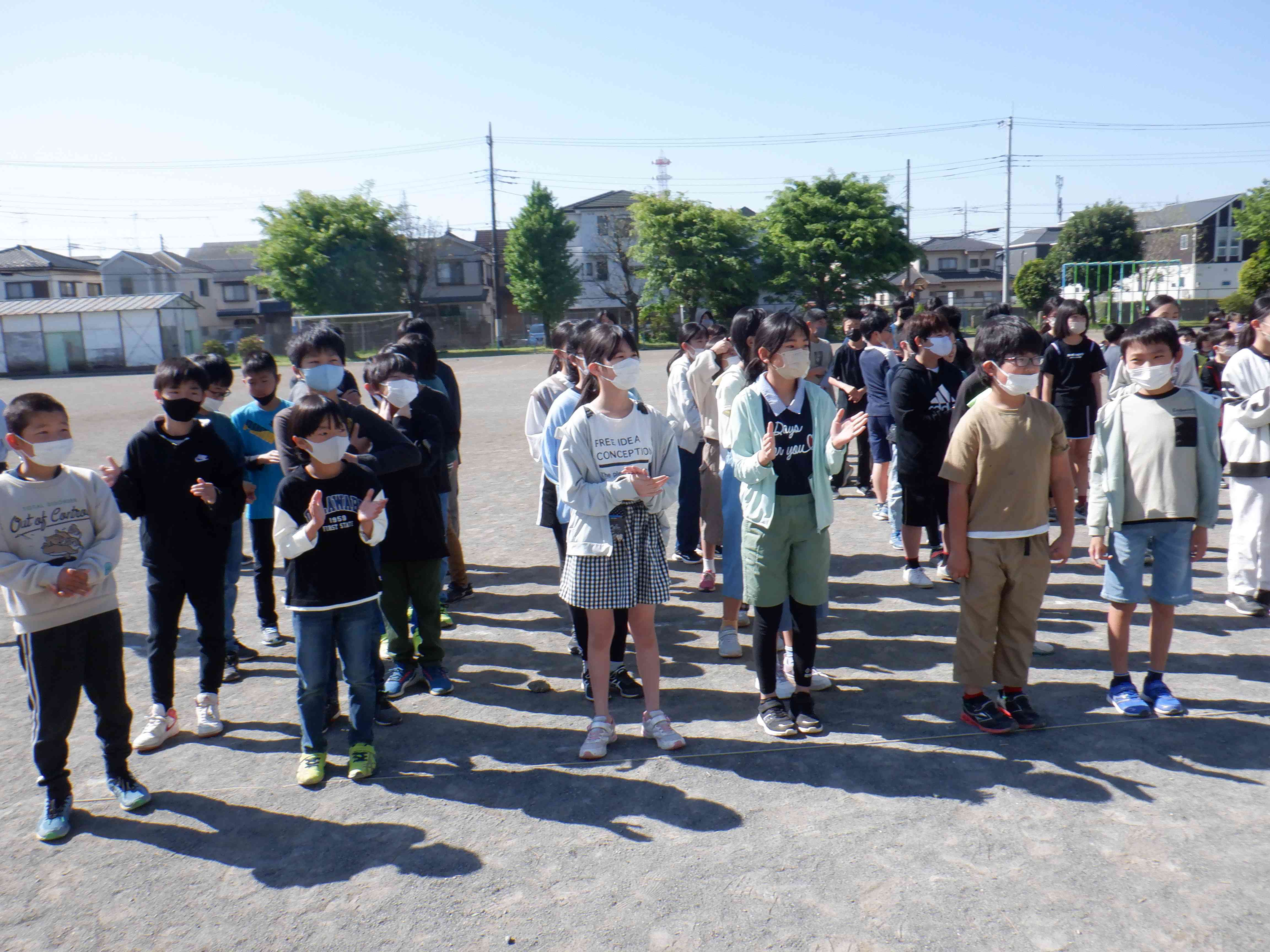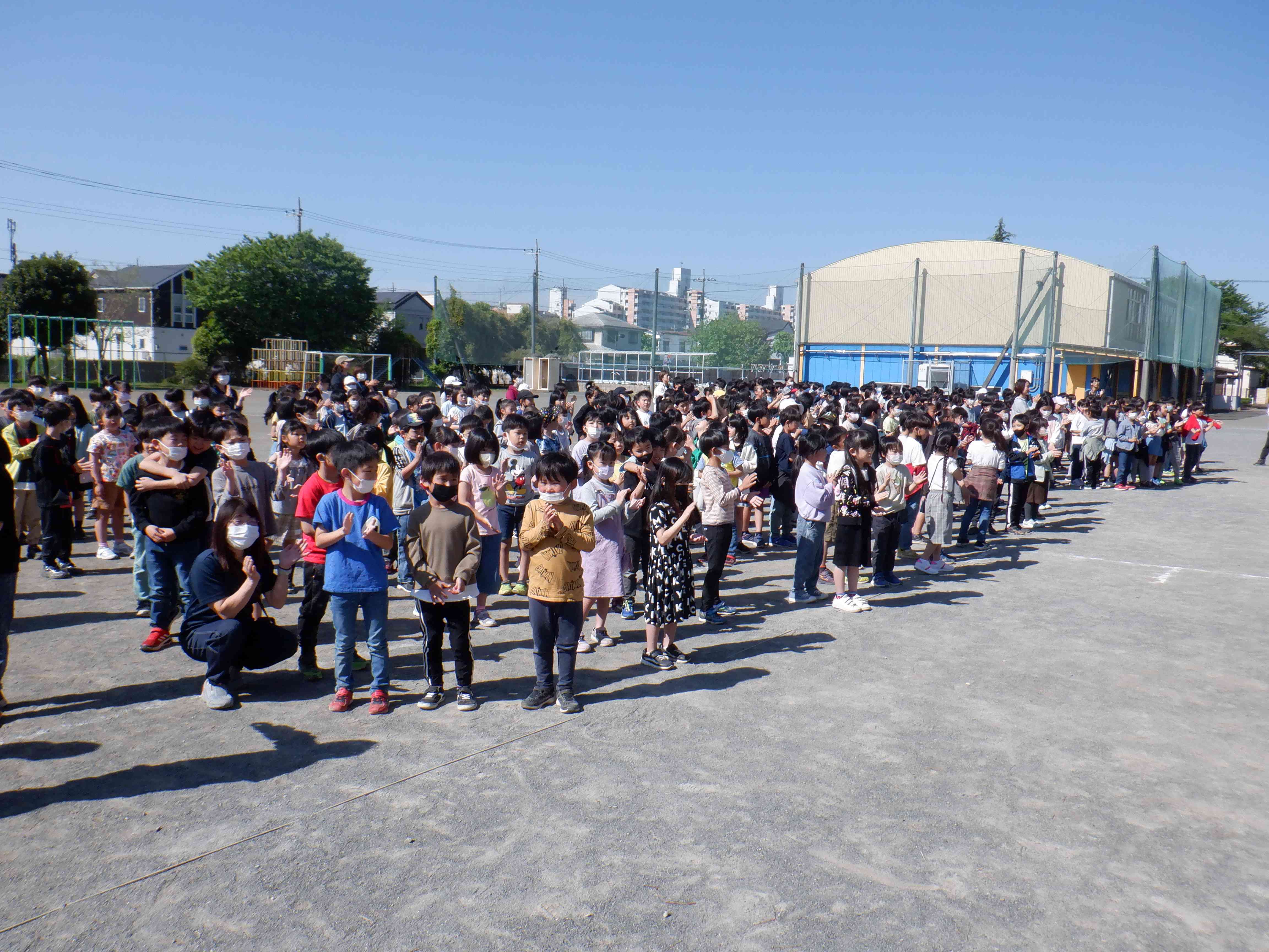 写真は2~6年生が拍手で1年生を迎える場面です。 入場後、1年生と向かい合い、『1年生を迎える会』の始まりです。