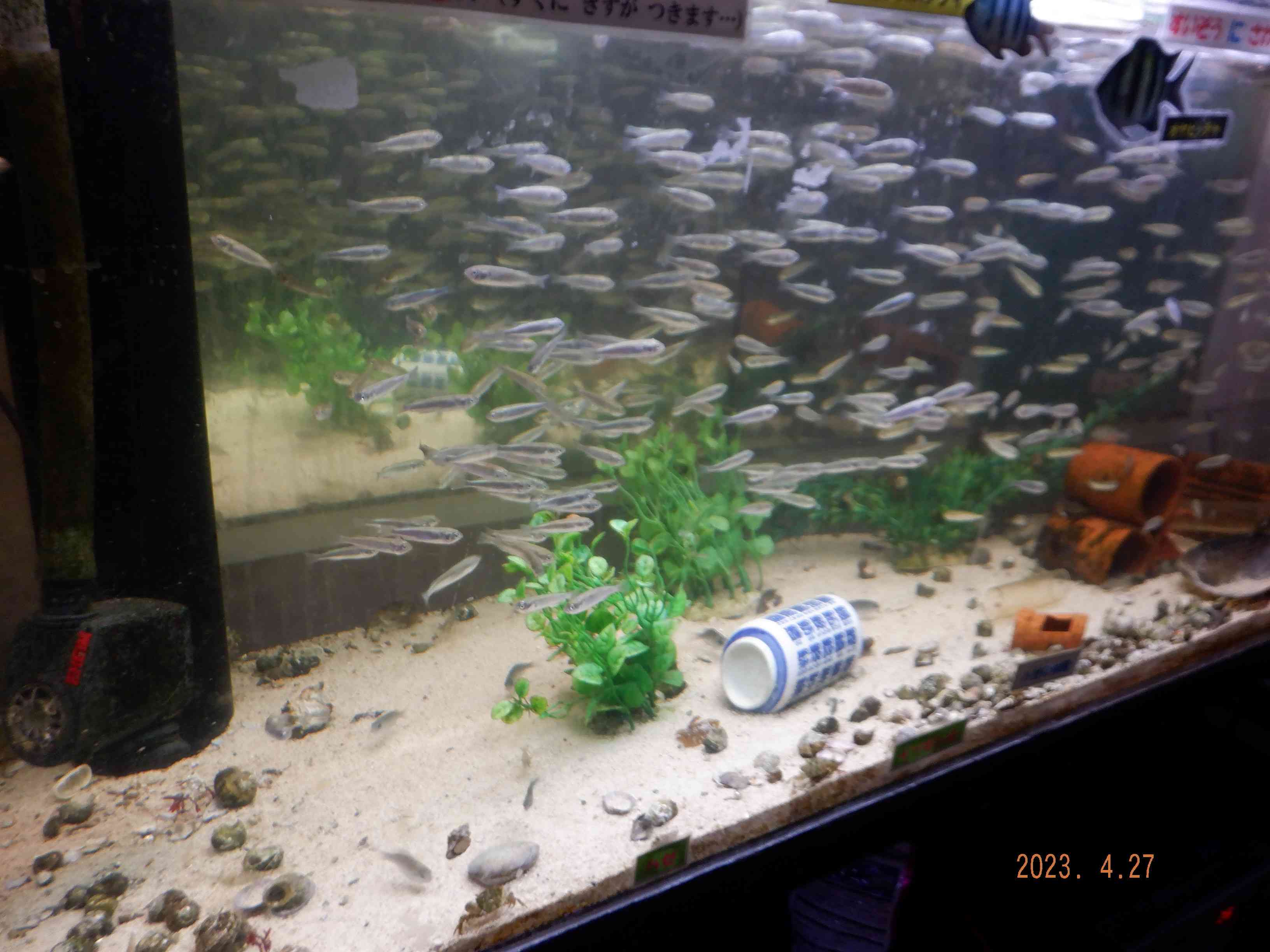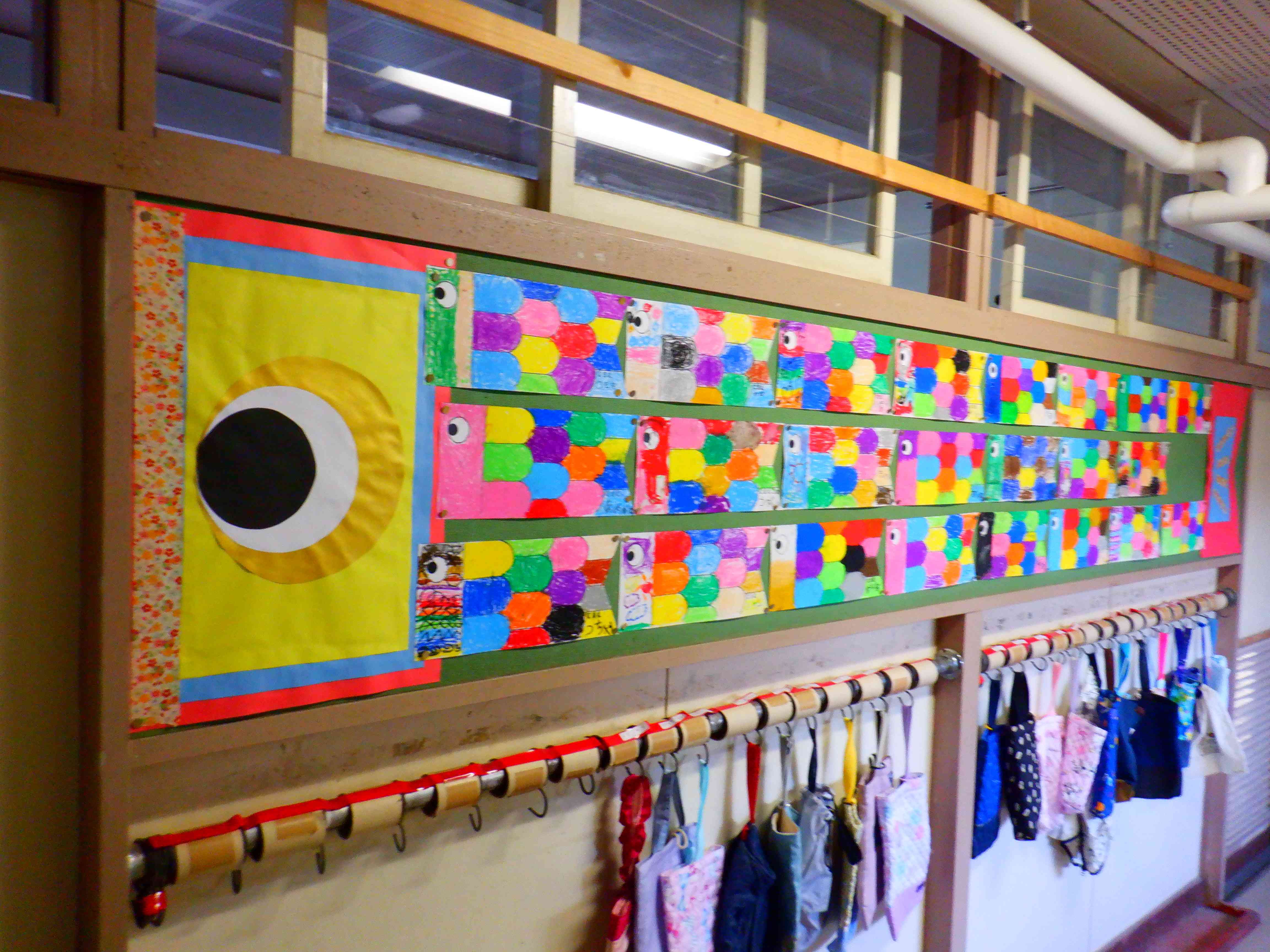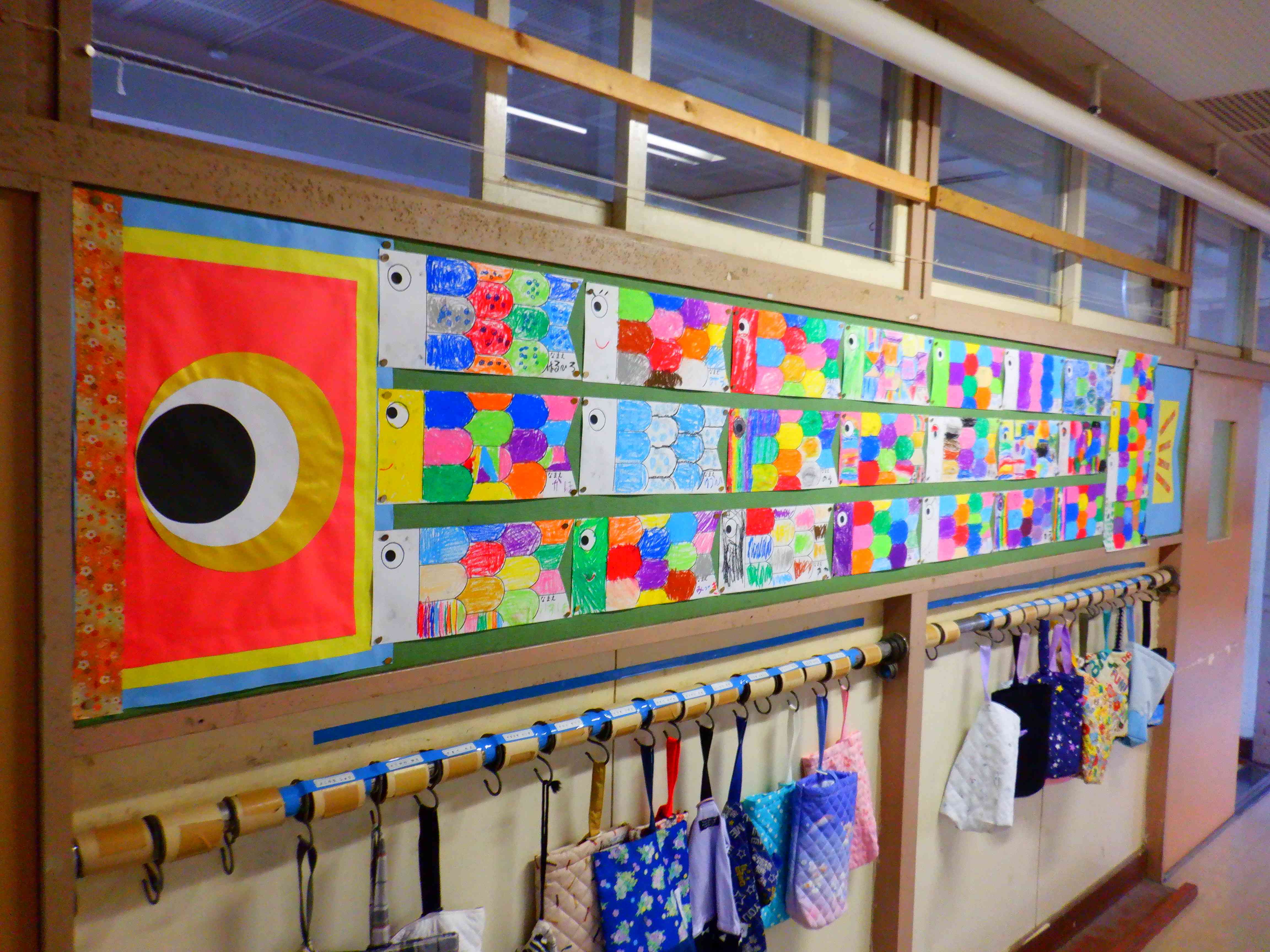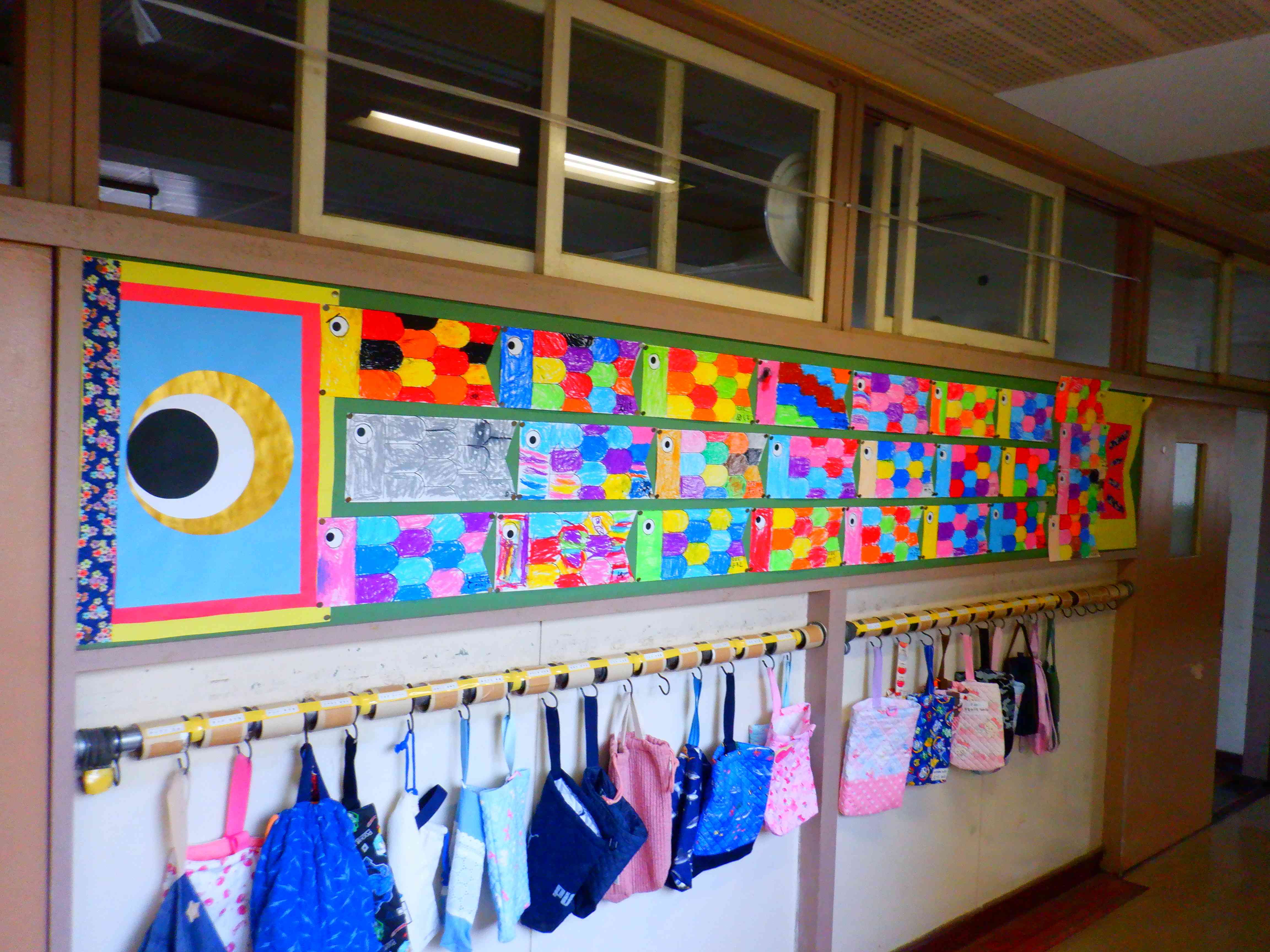 廊下の掲示物は定期的に変わる物が多くあります。 一階の廊下だと、図工の作品、各校の学校だより、水槽の魚他