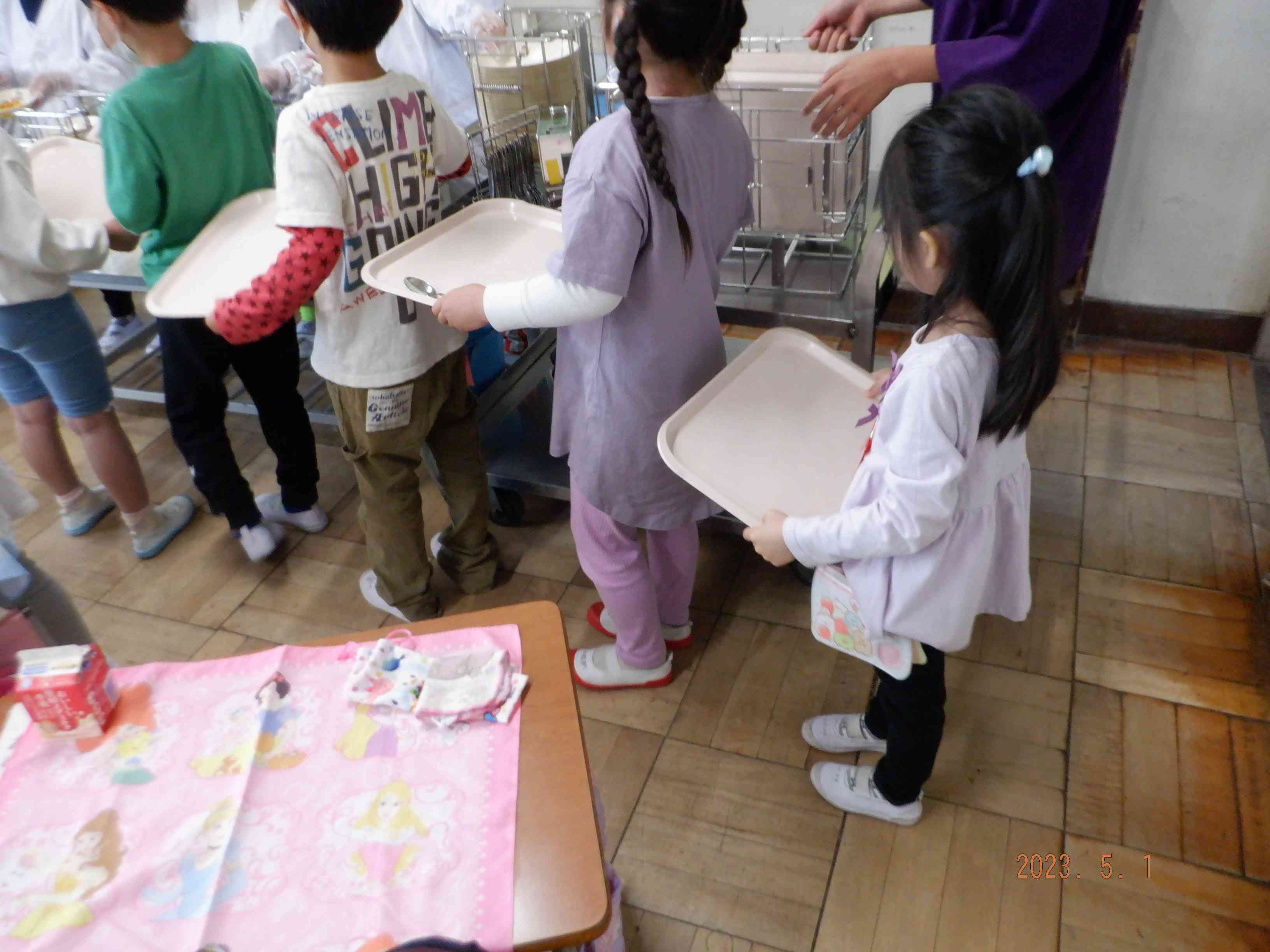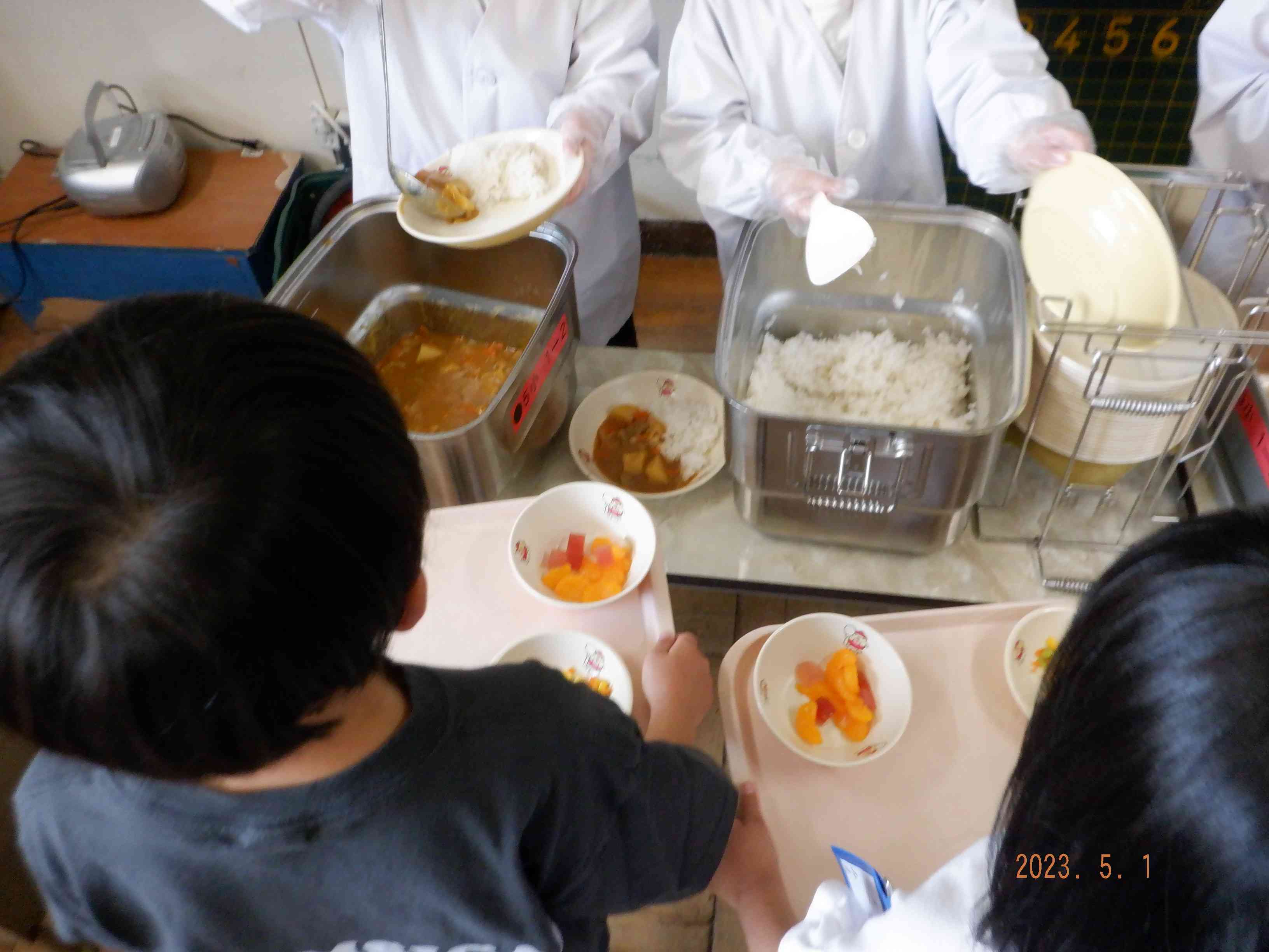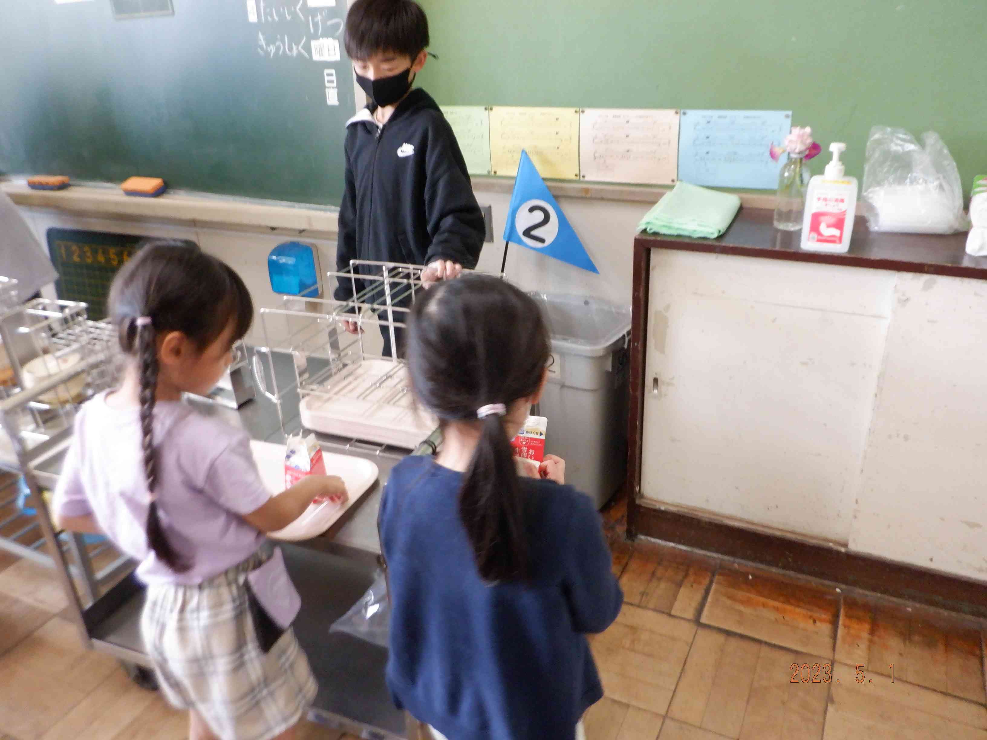 一年生の給食です。 準備や片付けに六年生が手伝いに来ています。