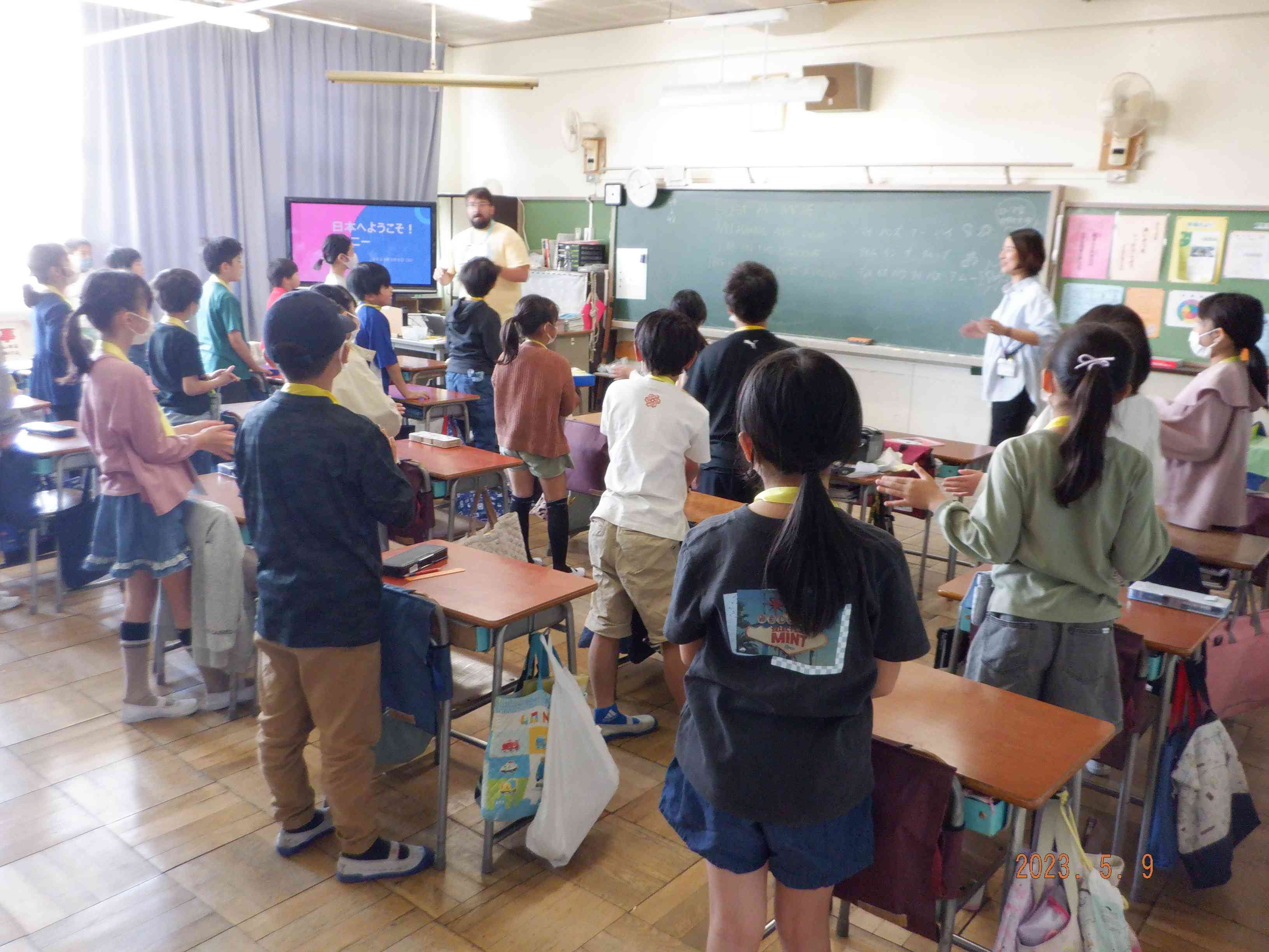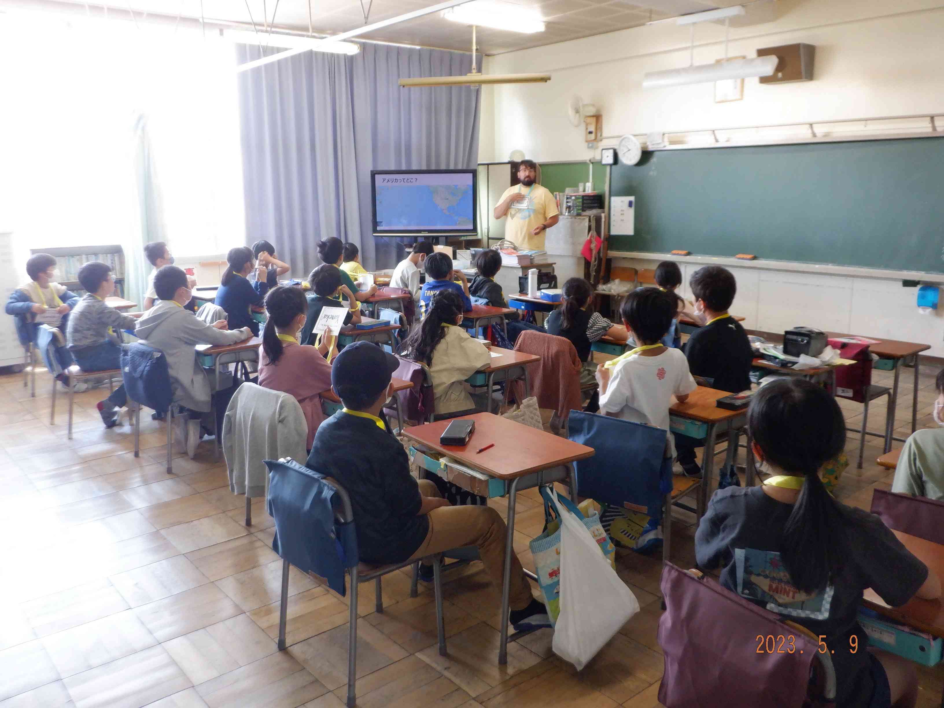 国際交流の一環として、アメリカのユタ州からジョニー・ベイジンガー先生をお招きし、4年生がアメリアの文化を学んだりアクティビティを体験したりしました。
