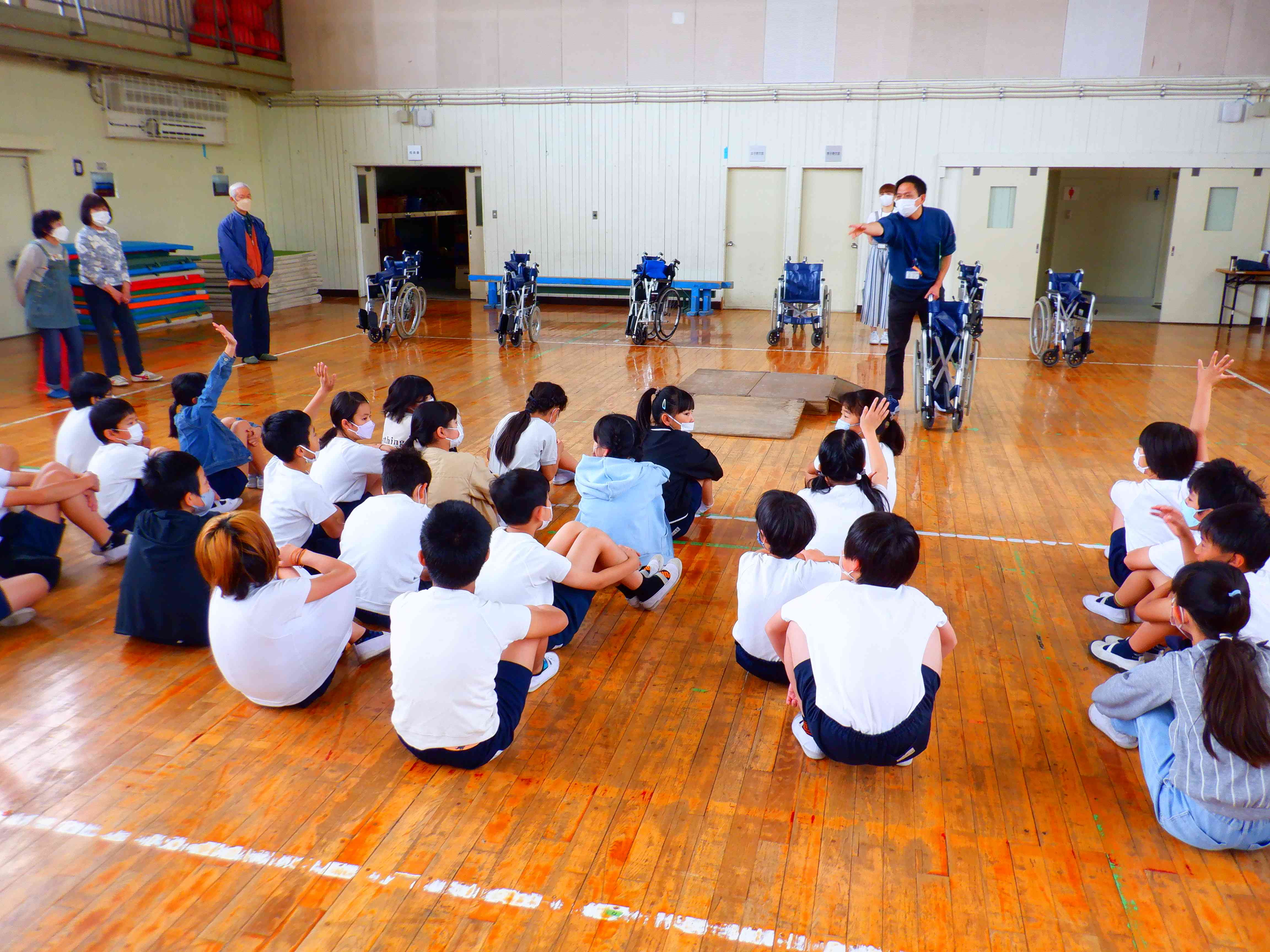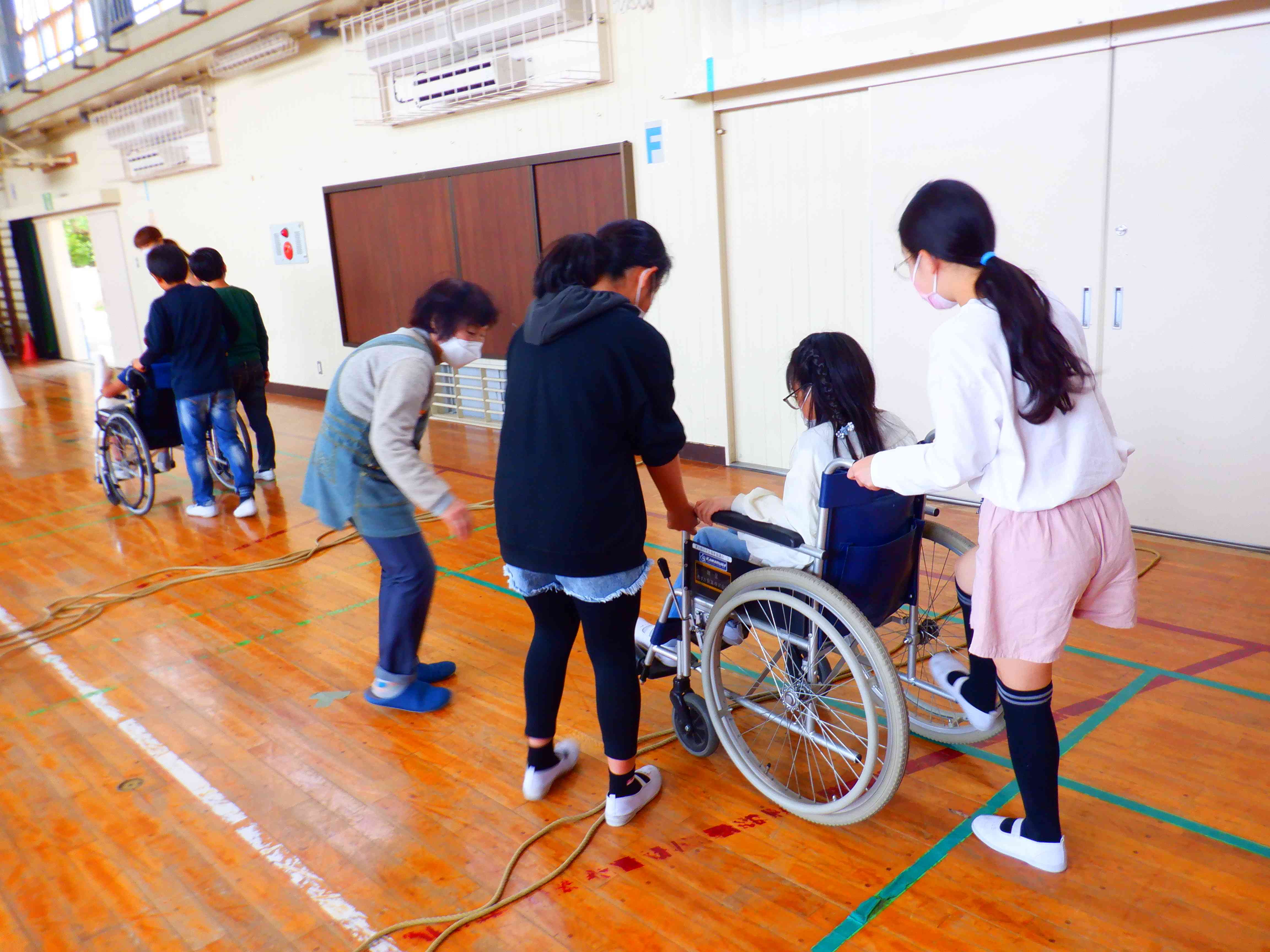 5年生が社会福祉協議会の方々にお越しいただき、車いす体験をさせていただきました。バリアフリーやユニバーサルデザインの学習の一環でもあります。