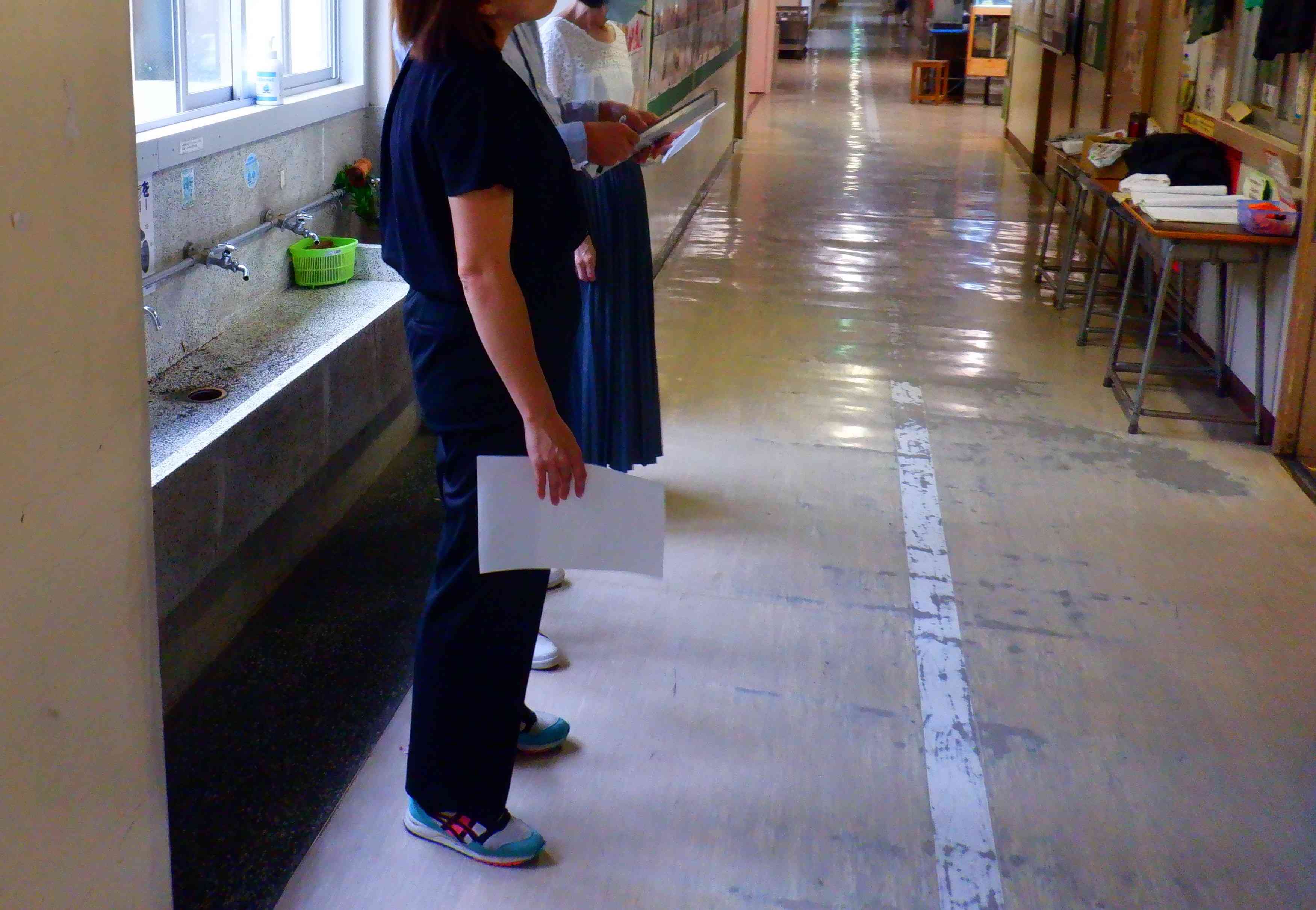 明日、天候が悪くなければ校庭で全校朝会を行う予定です。明日は生活指導の話があります。廊下では、先生たちがその練習をしています。明日は、どの先生が登場するでしょうか。