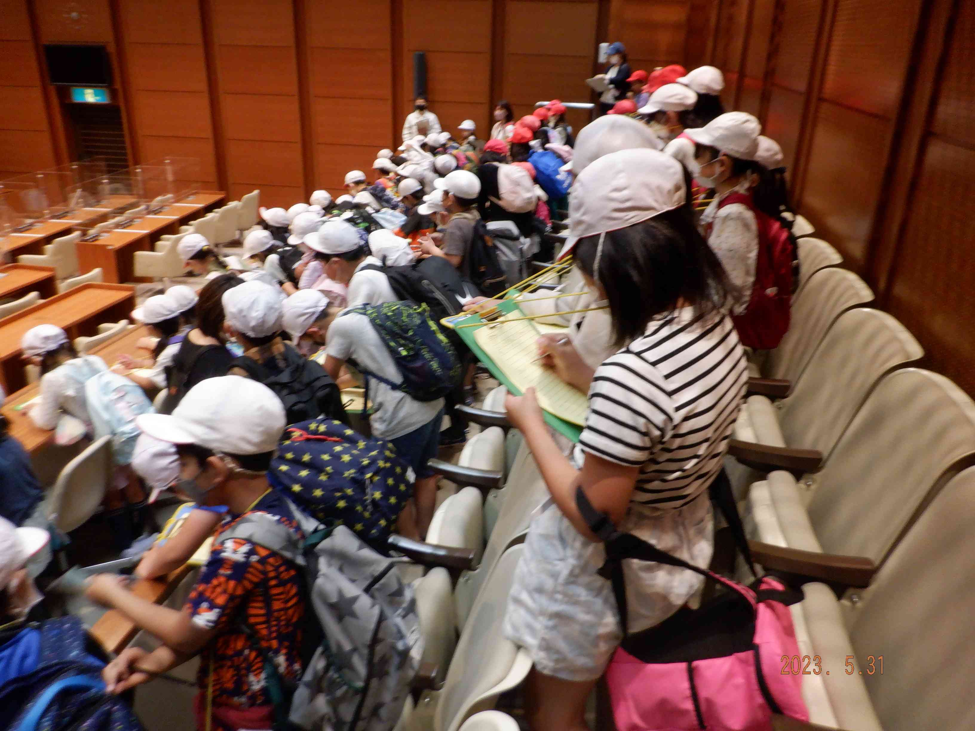 議場の見学では熱心にメモを取りつつ、初めて見る場内に興味津々の子供たちでした。