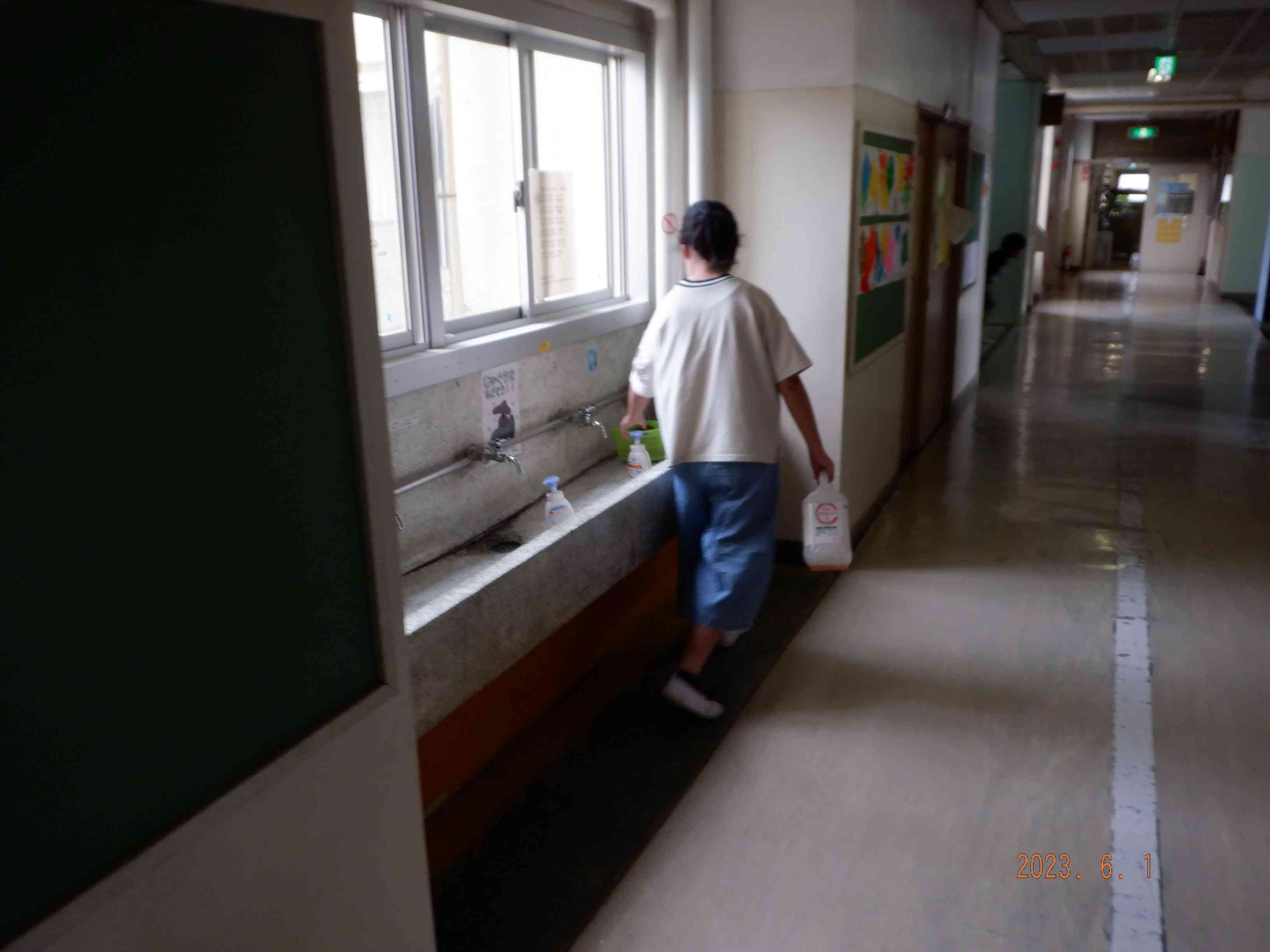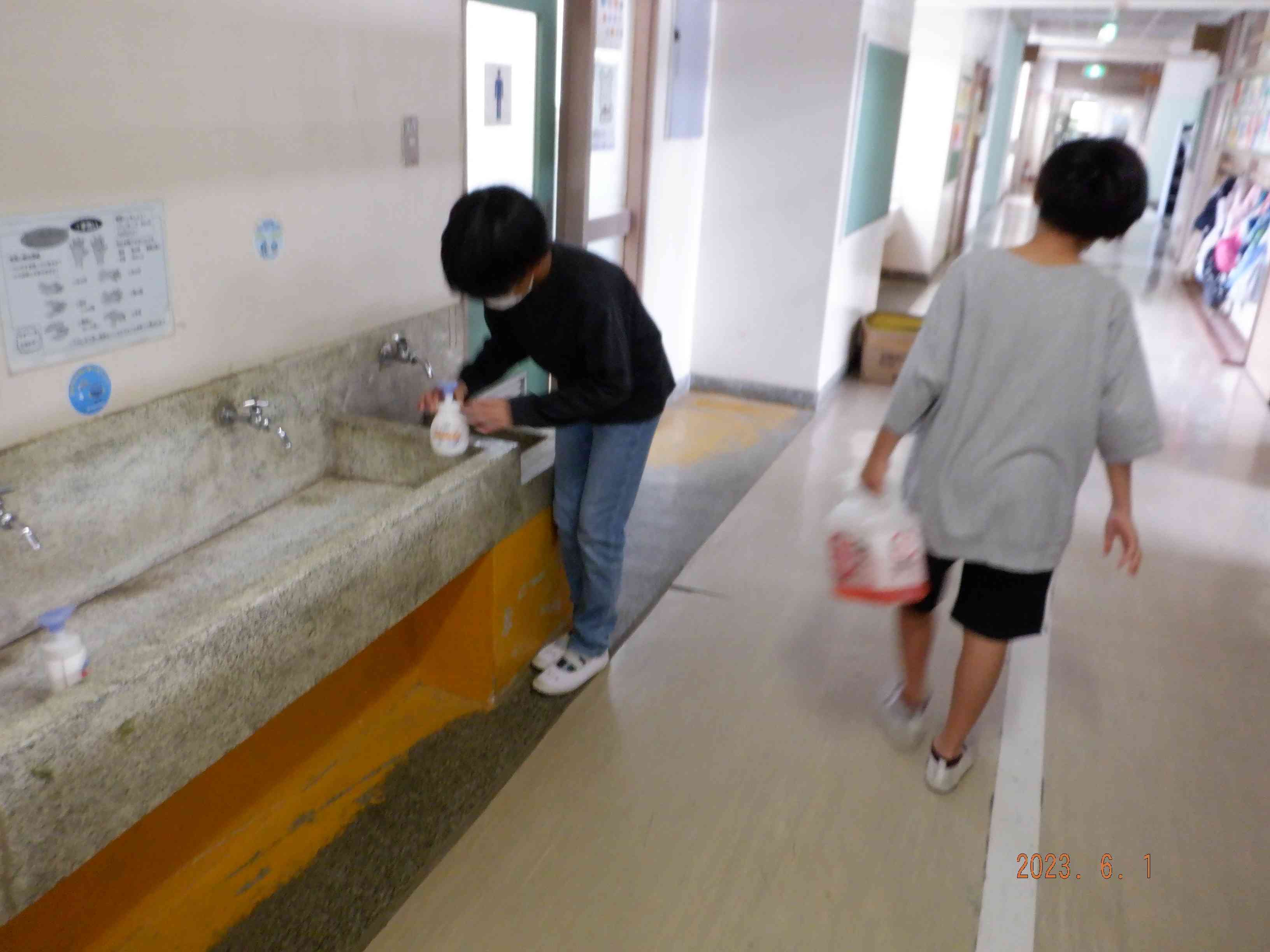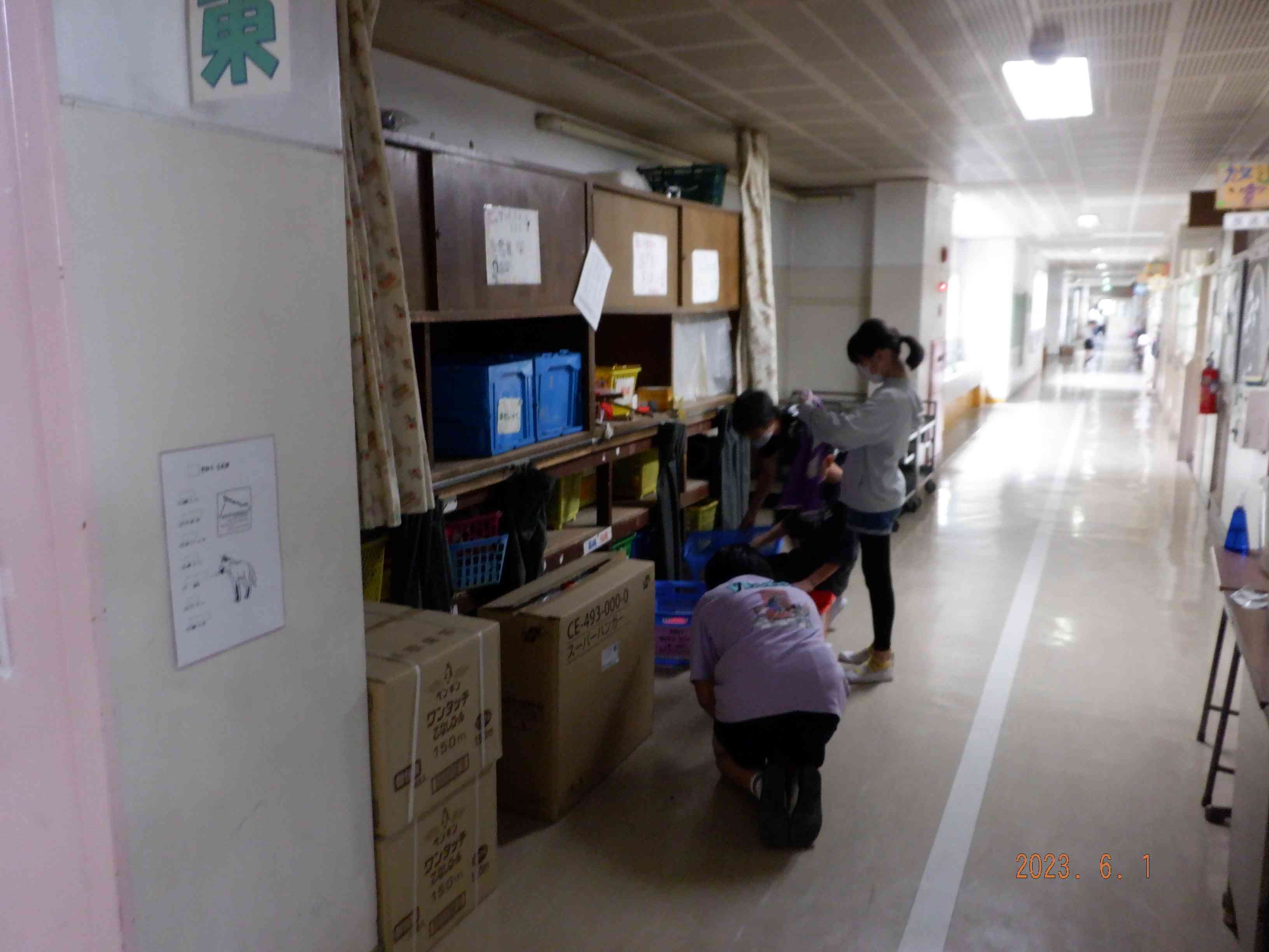 中休みに委員会や当番・係、等の仕事をすることがあります。写真は体育委員がゼッケンをたたんでいる場面と保健委員が石鹸を補充している場面です。
