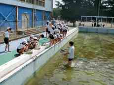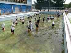 3年生が理科の時間にプールのヤゴを採集しました。 来週、プールの水を抜いて清掃します。 排水溝から流されてしまう前に「救出」しました。 はりきってがんばった3年生のおかげで、たくさんのヤゴを救出できました。 このあと、トンボになる羽化の瞬間を観察をします。