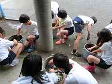 5年生が田植えをしました。 専門家から本格的な土作りや田植えの仕方を教わりました。 職員室前の田んぼとバケツ稲の両方に挑戦します。 社会で日本の農業を学習する時に栽培体験をいかします。