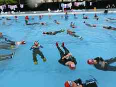 5年生が服を着たままプールに入る「着衣泳」を体験しました。 いざというとき、服がいかに重たくなるかを実感しました。 また、ペットボトルや靴が「浮き輪」の代わりになることも体験しました。 もちろん、役立つ場面がないようにする安全への判断力が一番大切です。